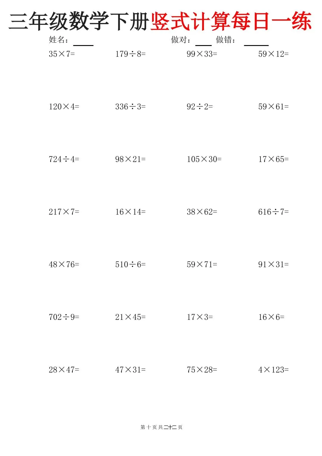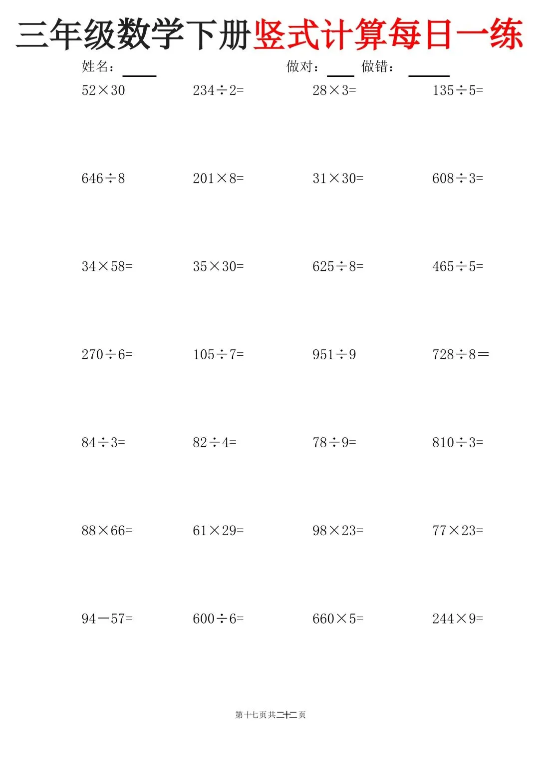 需要的家长可以打印出来,让孩子练习一下这份三年级下册数学竖式计算每日一练,帮助孩子提升计算准确率与速度,夯实计算基本功,减少考试失分。日积月累,孩子计算又快又准,数学信心满满!