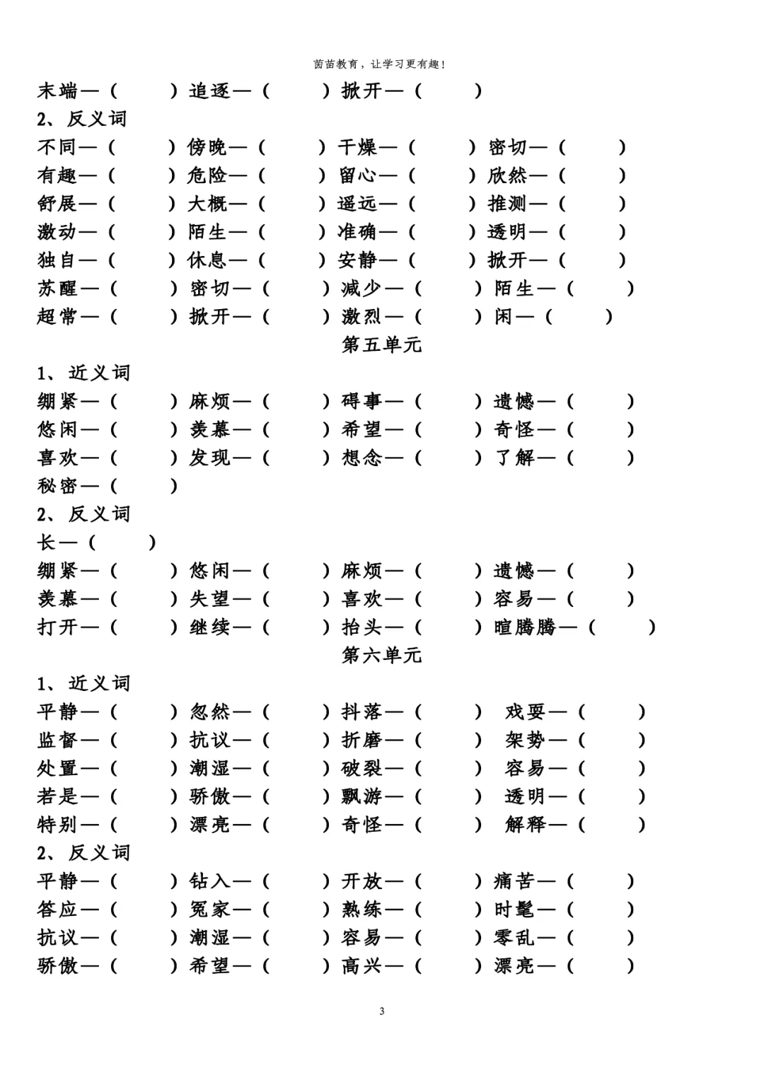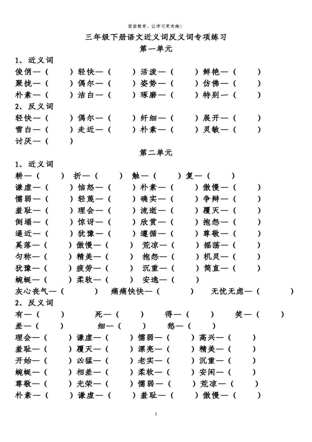 三年级下册语文全册近义词反义词专项练习pdf,附答案