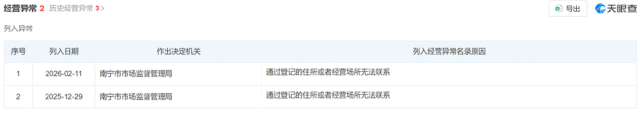 公开信息显示,同正旭宁小贷成立于2013年,注册资本为5000万元。同正旭宁小贷第一大股东为桂林市亿铭贸易有限公司,持股比例20%,其余股东均为个人。天眼查显示,同正旭宁小贷因通过登记的住所或者经营场所无法联系,多次被南宁市市场监督管理局列入经营异常。