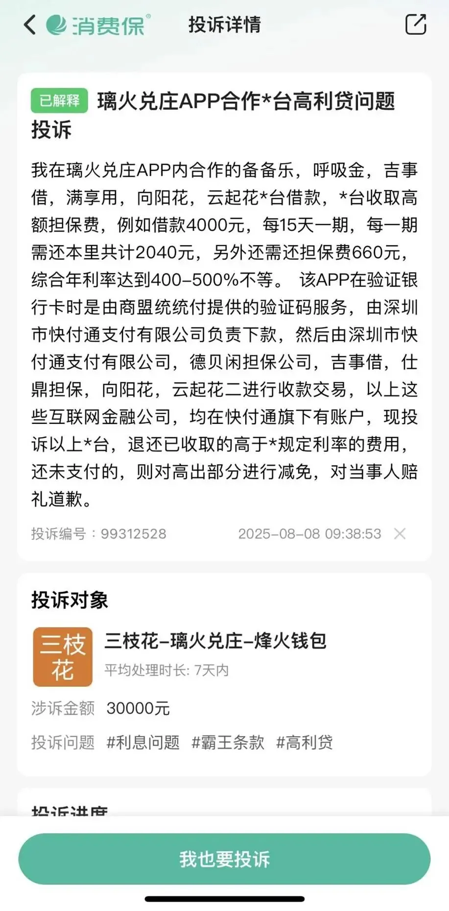 一名消费者投诉表示,在璃火兑庄App内合作的备备乐、呼吸金等平台借款,平台收取高额担保费。例如借款4000元,15天1期,分2期还款,本息每期需还2040元,此外每一期还需还担保费660元,综合年化利率较高。