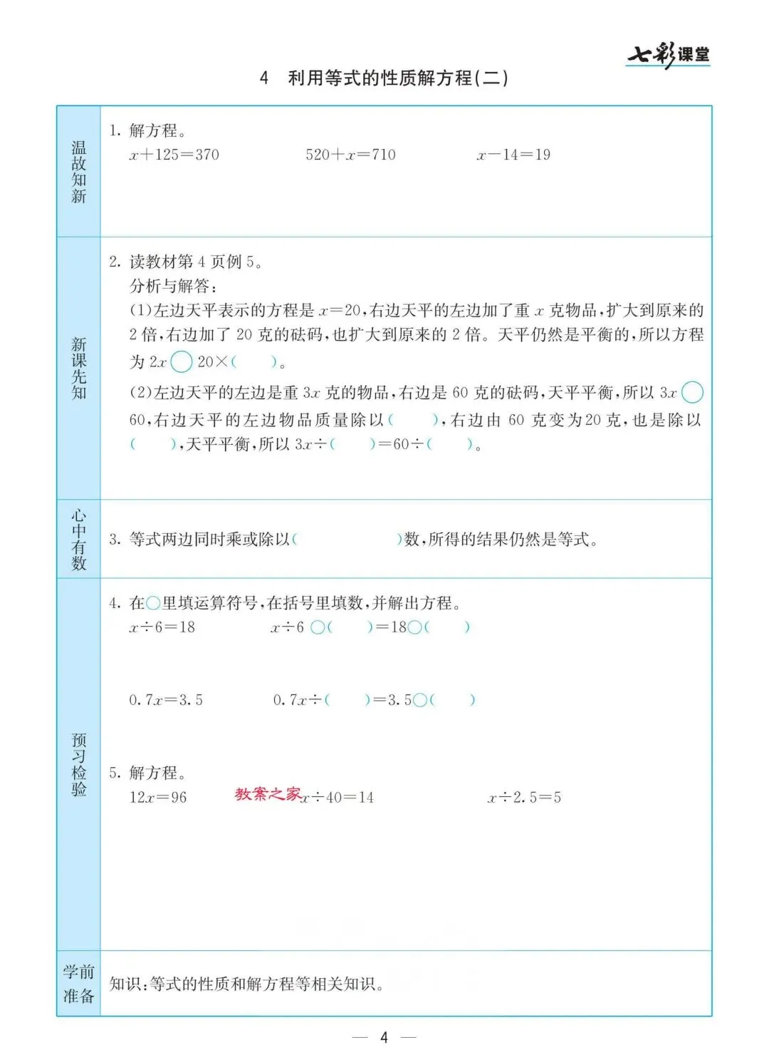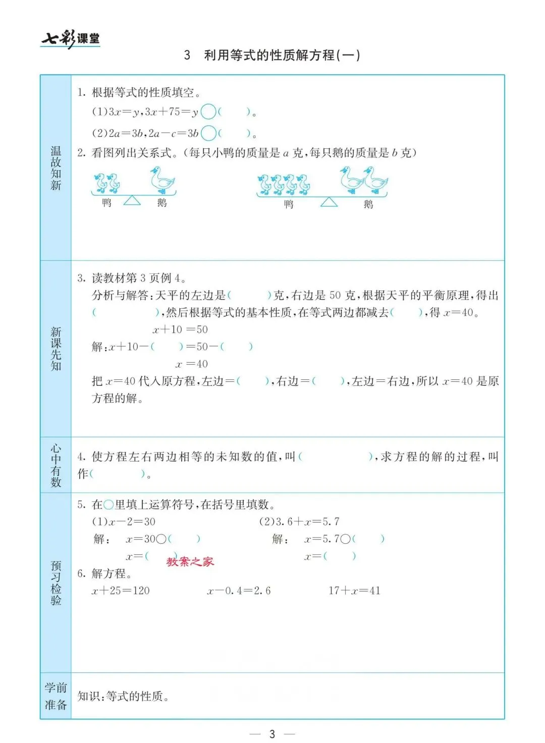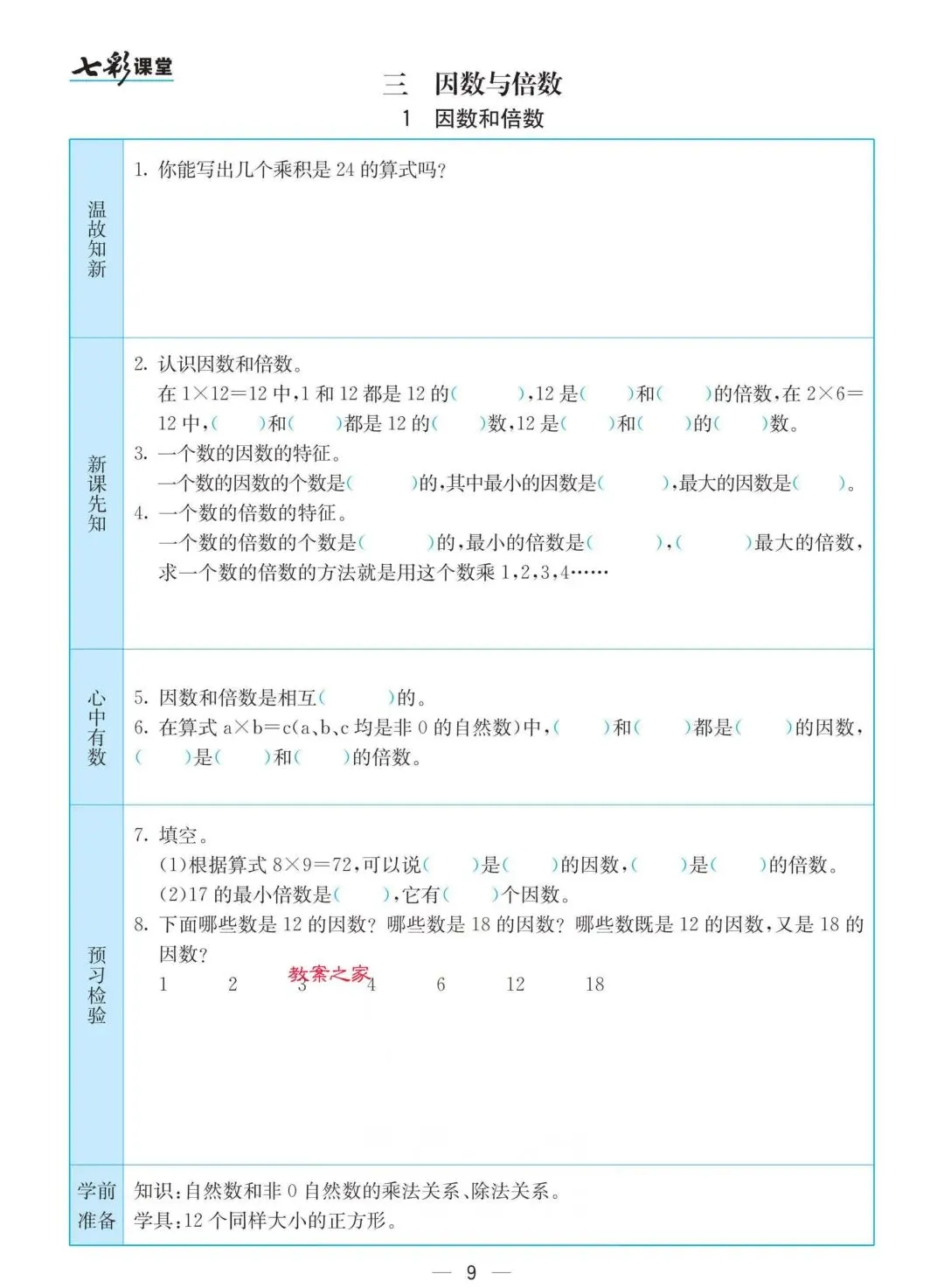 苏教版五年级下册数学预习卡 含答案 电子版可打印