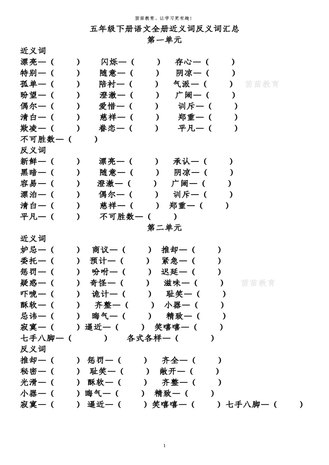 五年级下册语文全册近义词反义词专项练习pdf,附答案
