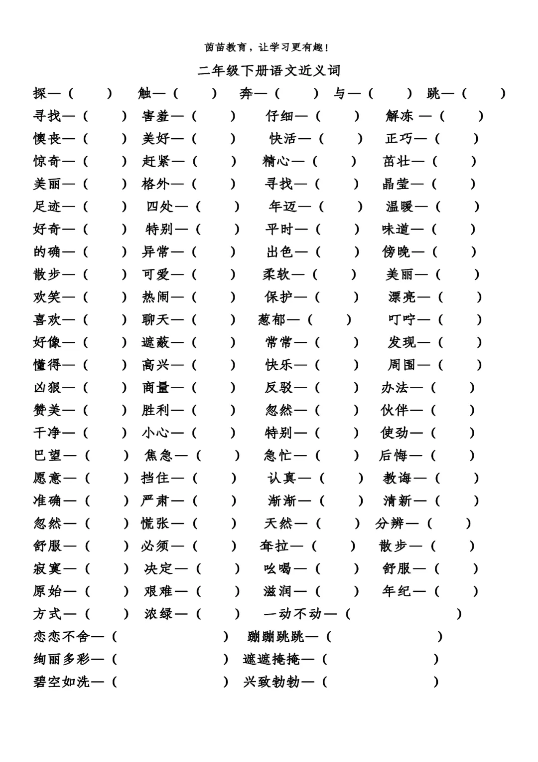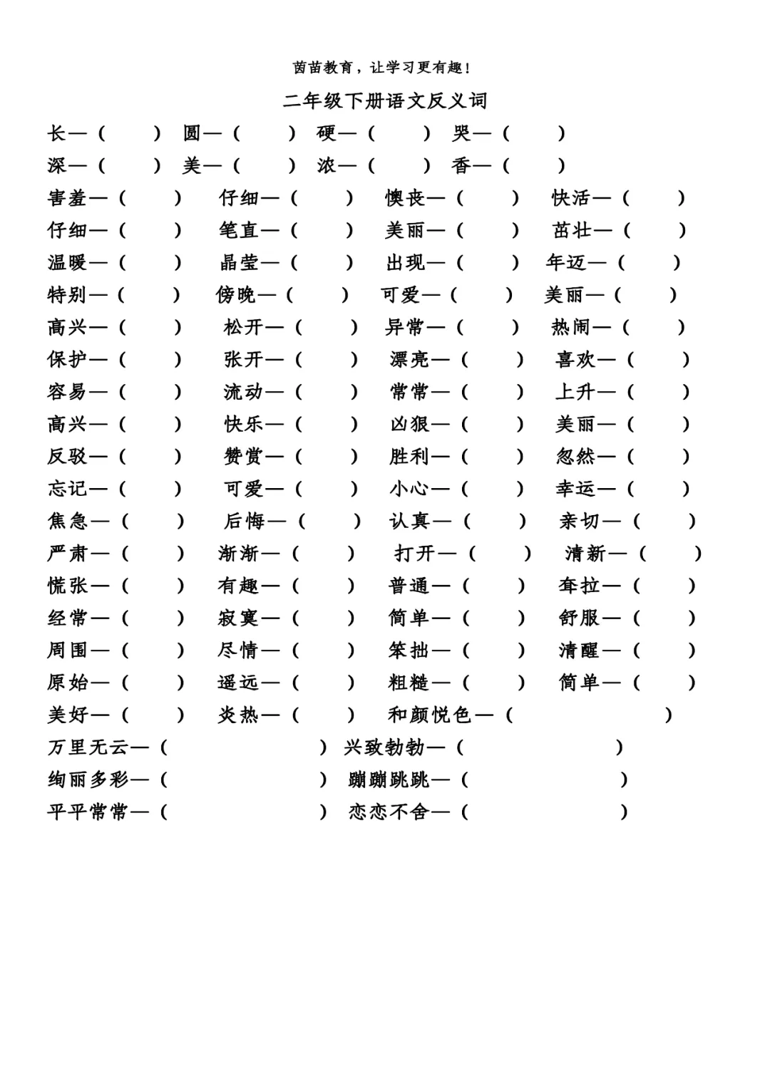二年级下册语文全册近义词反义词专项练习pdf,附答案