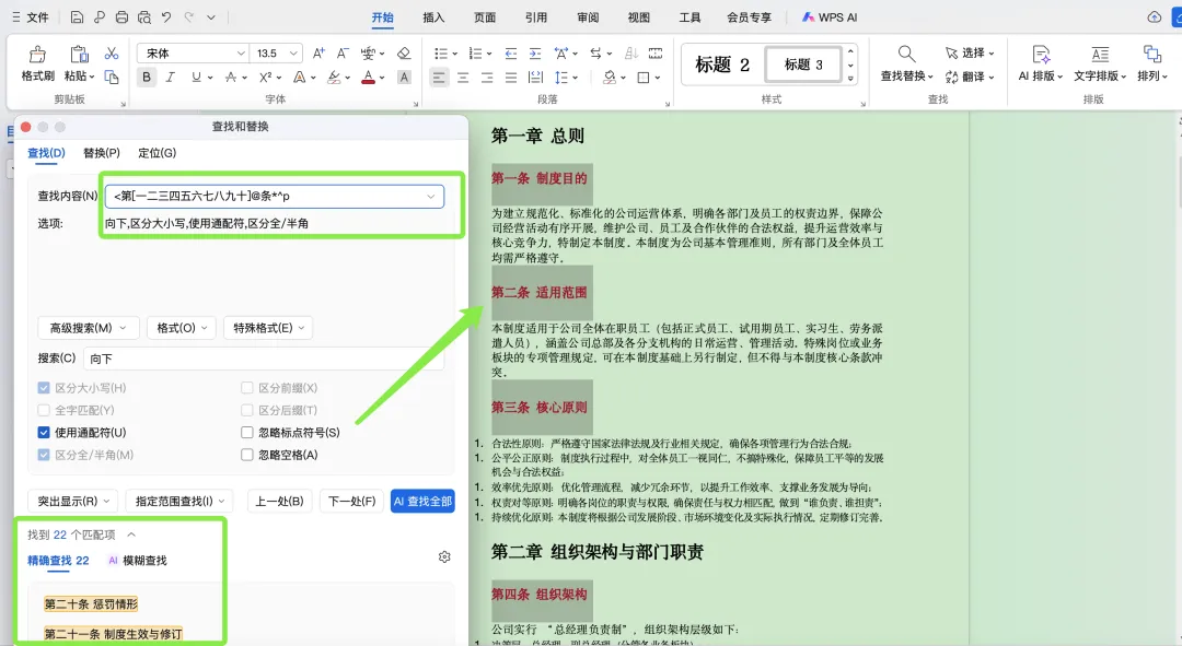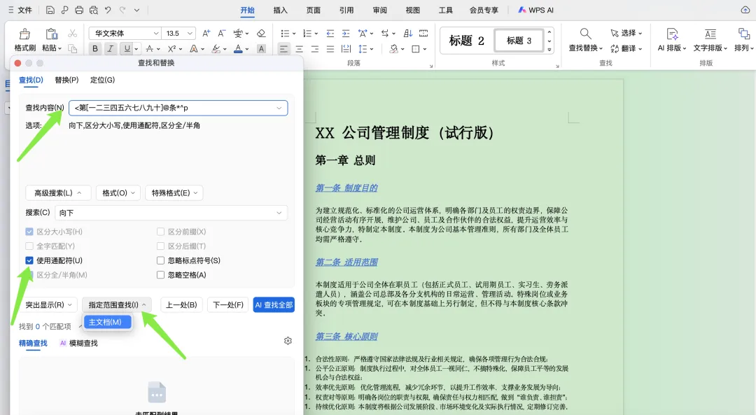 我们在开始选项卡下找到查找替换,之后在查找内容处输入<第[一二三四五六七八九十]@条*^p;勾选使用通配符,查找范围选择主文档⬇️