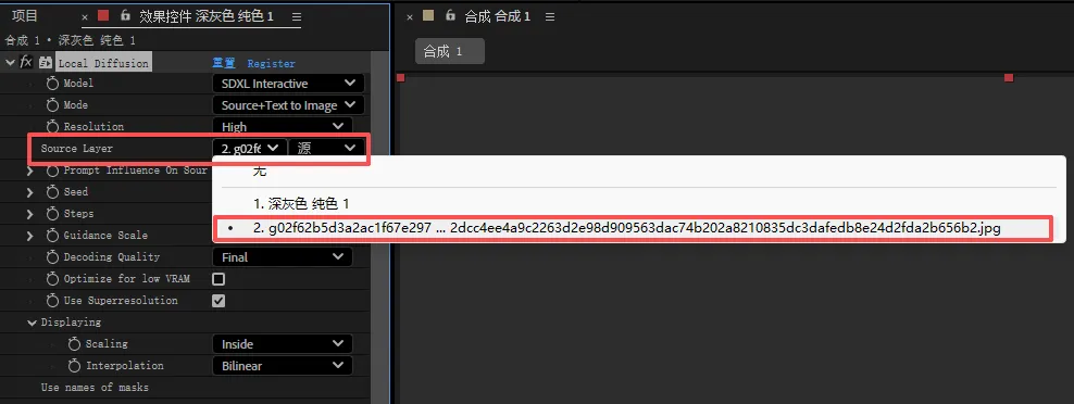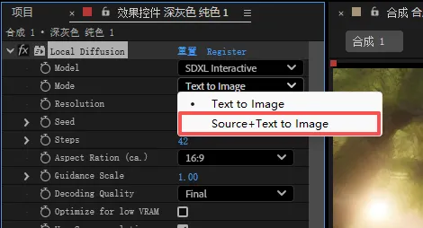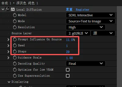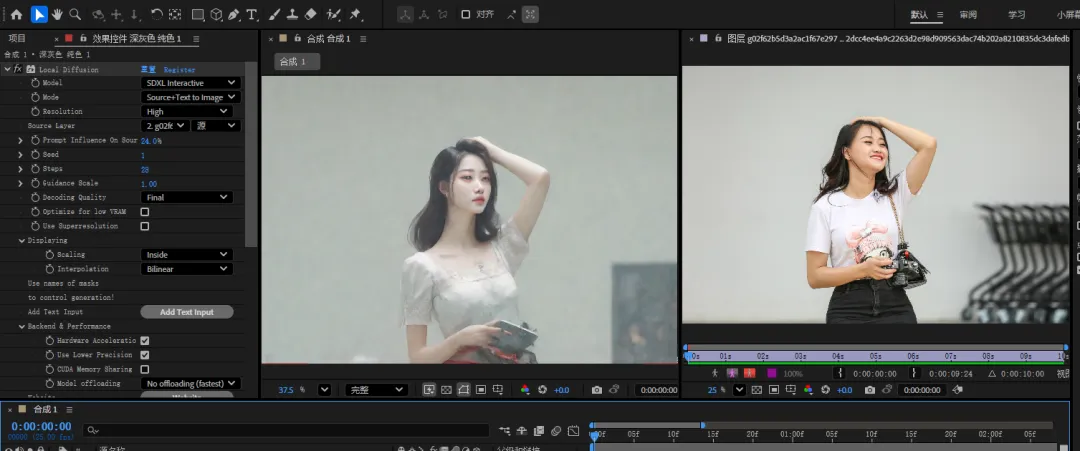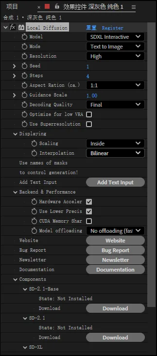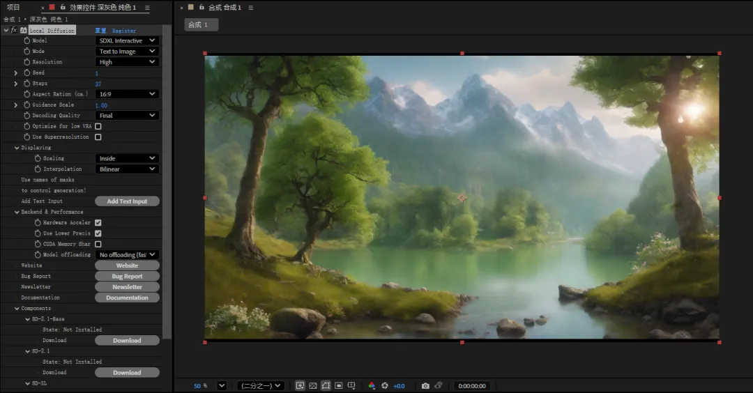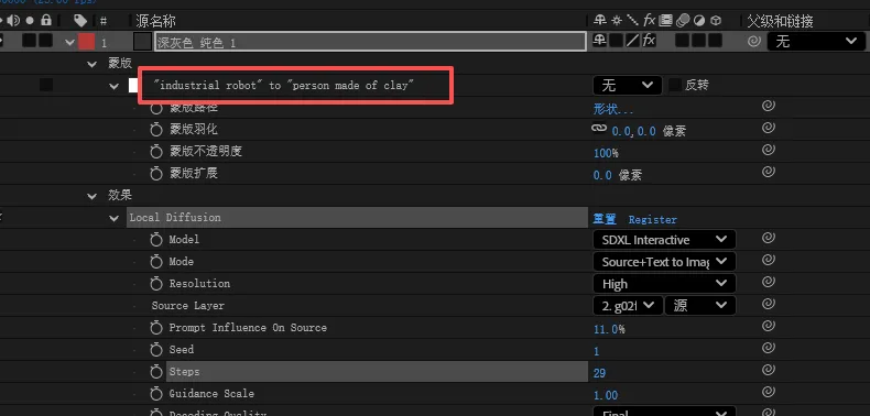 既然是 AE 插件,所有的操作就都和插件效果的操作一致,AI 图像参数的调整全部都在 AE 中完成,包括文本提示词的输入,需要英文输入,不能直接使用中文。