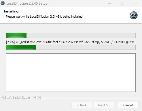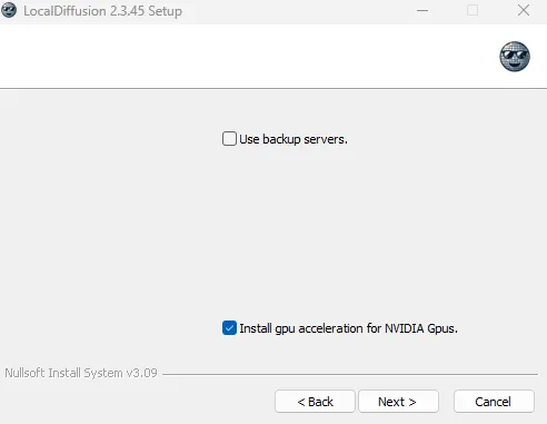 双击打开 LocalDiffusion-v2.3.45.exe 安装程序,点击下一步 NEXT,会有提示勾选,建议勾选上使用备份服务器这样后面在线下载时速度会更快。