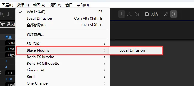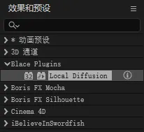 在效果和预设中找到 Blace Plugins-Local Diffusion,可以直接拖拽到图层上,插件自动应用;或者选中图层,在菜单栏效果中 Blace Plugins-Local Diffusion。一样可以找到,直接点击应用。