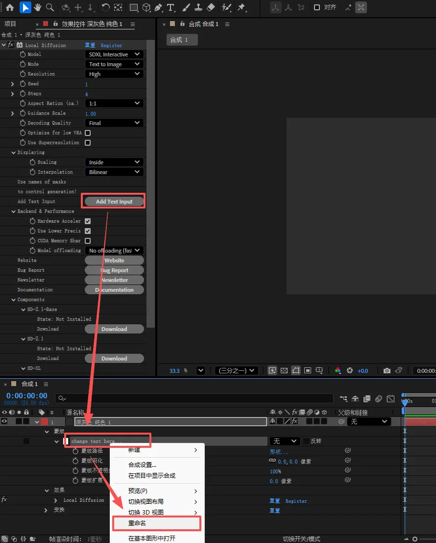 在效果控件中找到Add Text Input点击,下方图层中会自动生成一个蒙版,鼠标右键重命名,文生图提示词就是在这里了,可以直接输入。