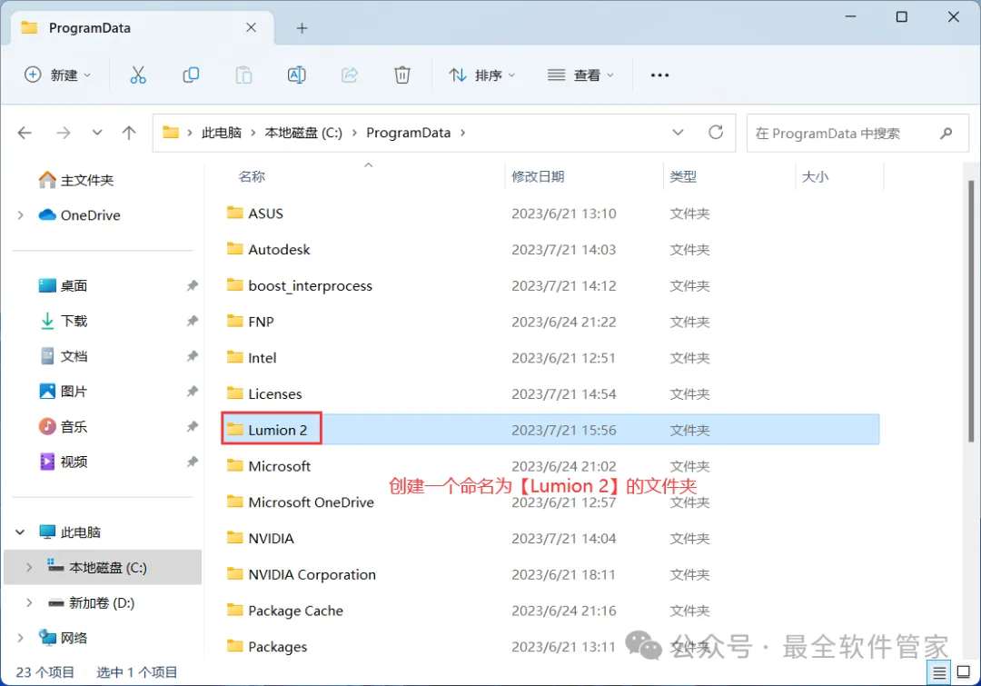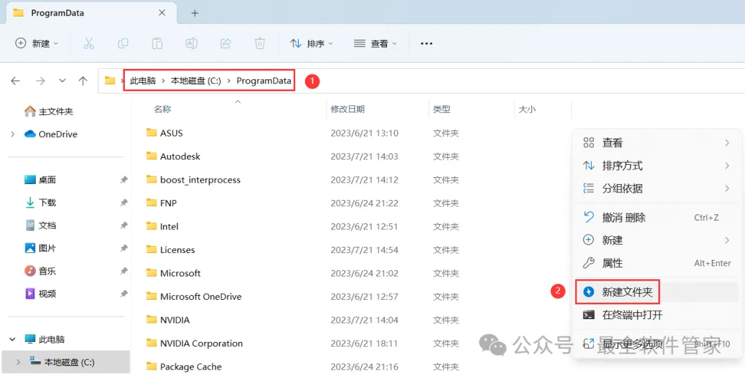 11、打开路径:C:/ProgramData,右键点击【新建文件夹】