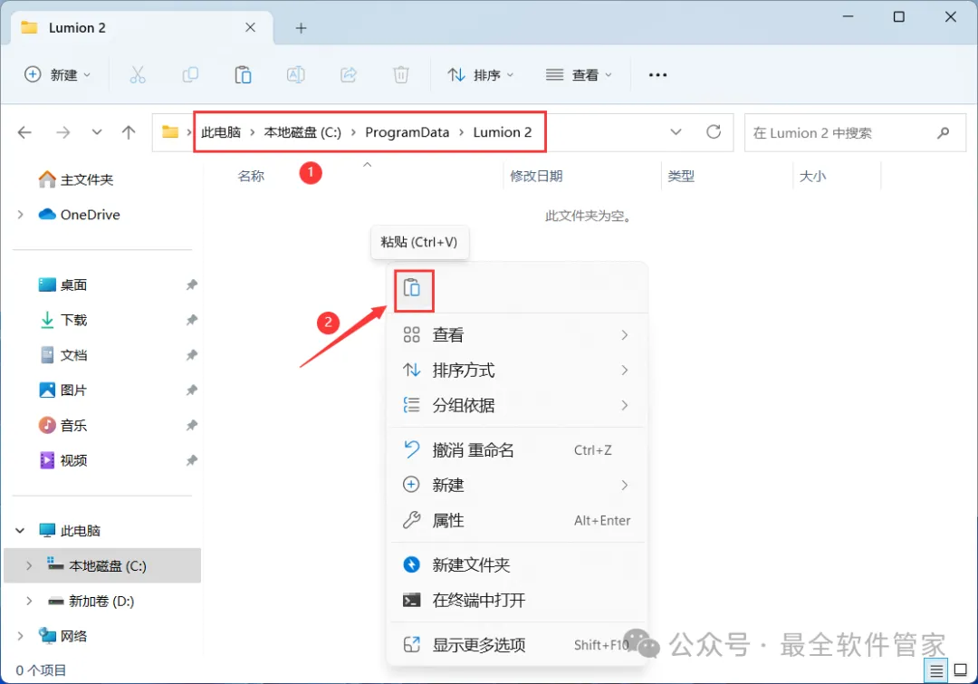 15、打开路径:C:/ProgramData\ Lumion 2,再右键文件夹的空白处,点击【粘贴按钮】