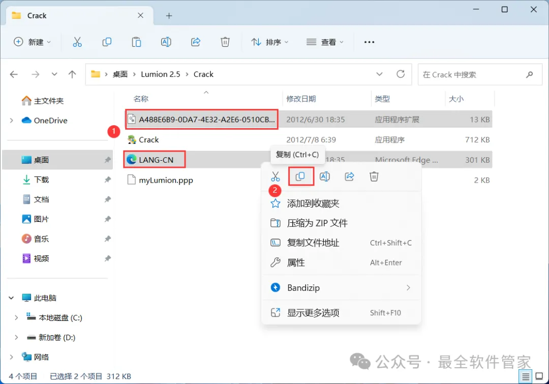 28、回到Crack文件夹,找到并选中【A488E6B9…】和【LANG-CN】文件,再右键点击【复制按钮】