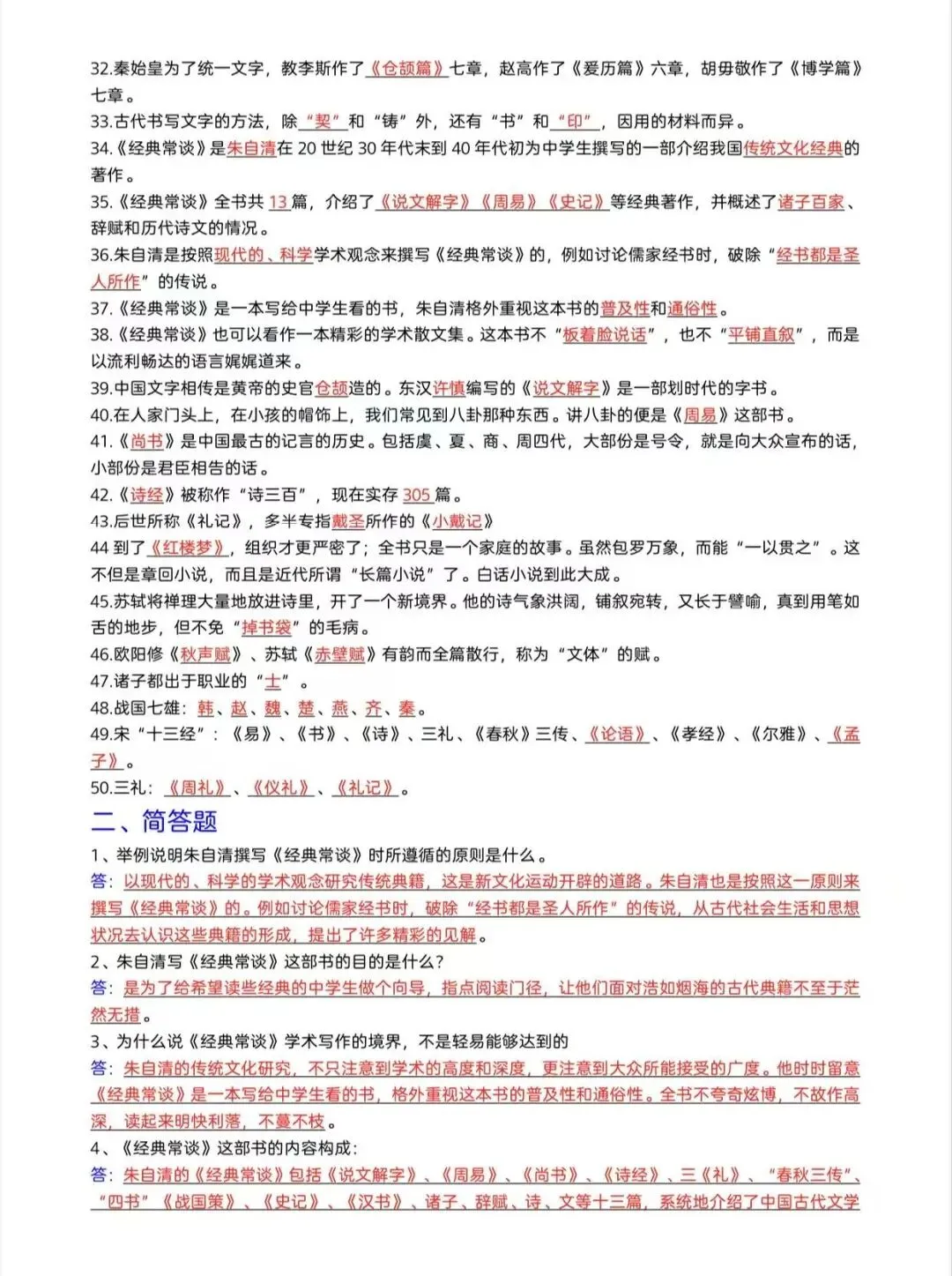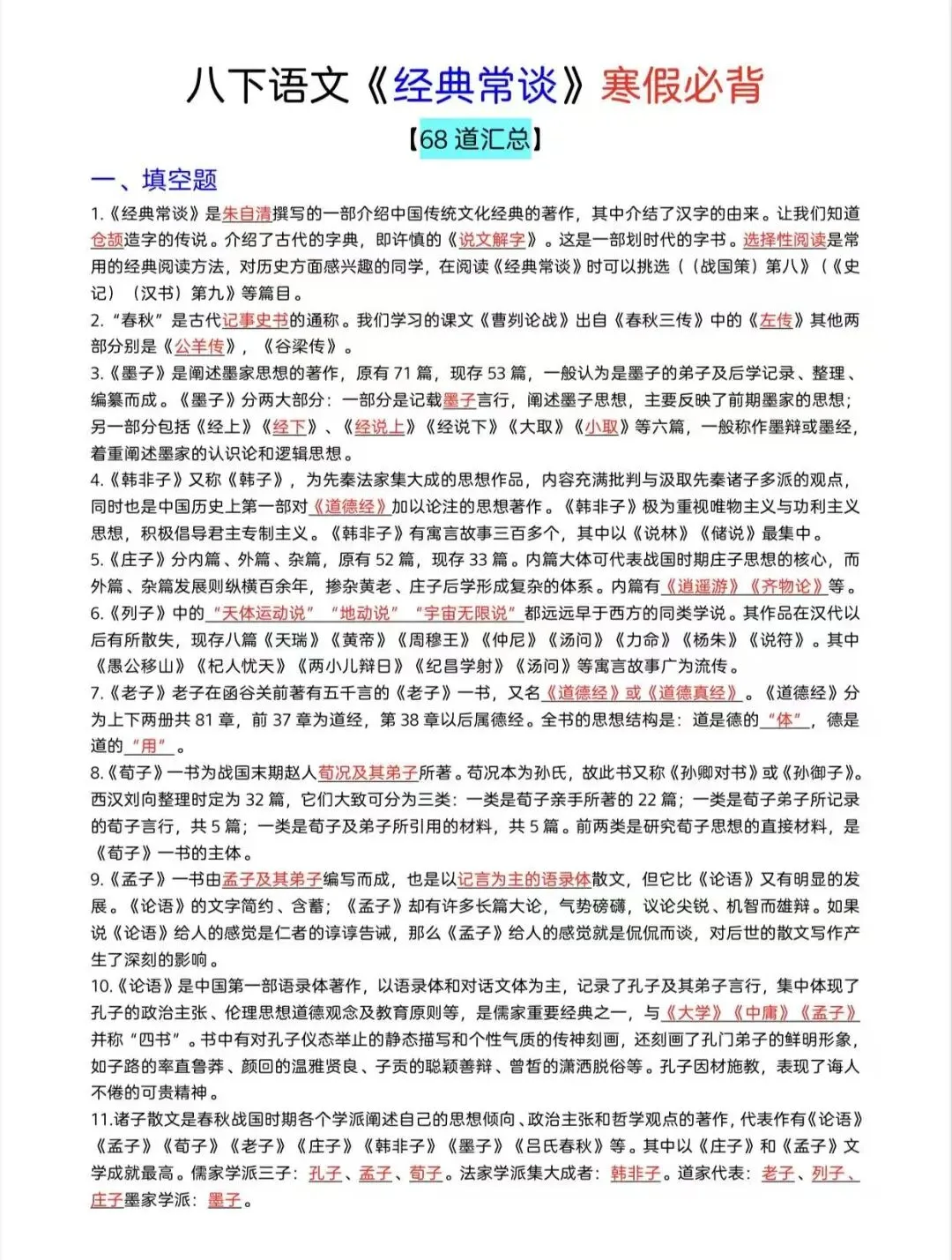 八年级下语文《经典常谈》必背68道/电子版可打印