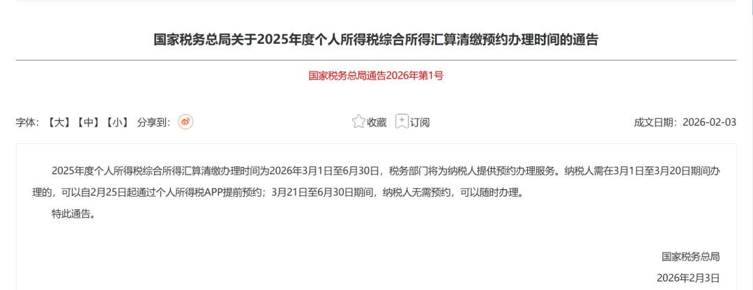 通告明确,2025年度个人所得税综合所得汇算清缴办理时间为2026年3月1日至6月30日,税务部门将为纳税人提供预约办理服务。