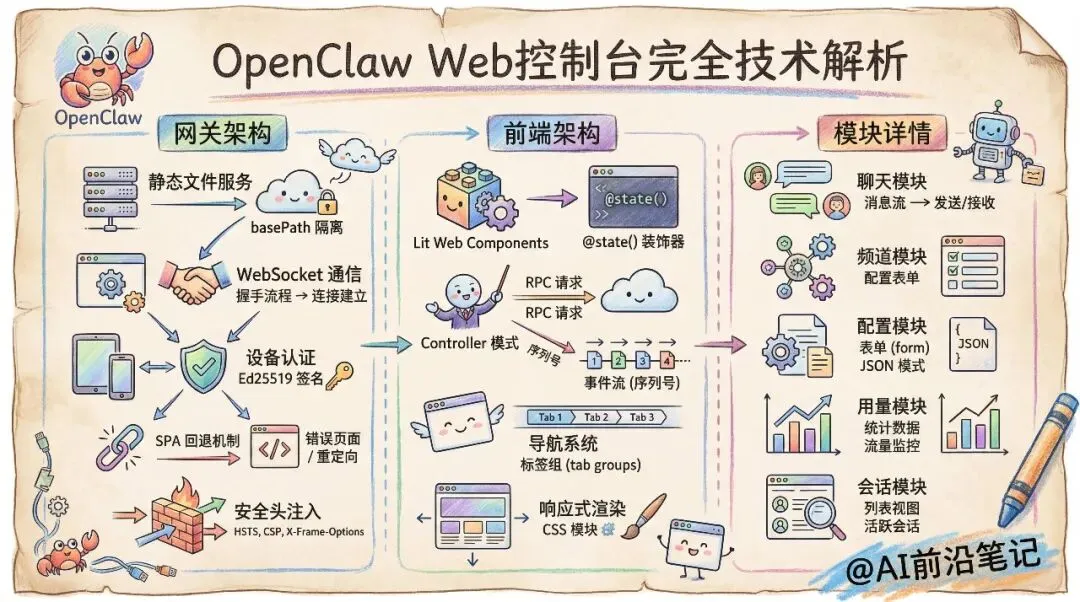 OpenClaw 的 Web 控制台是一个基于 Lit 的单页应用(SPA),与 Gateway 共享同一端口。用户通过浏览器访问 `/ui` 路径即可打开控制面板,实时管理 Agent、通道、会话和配置。本文从静态资源服务、WebSocket 通信、设备认证到前端组件架构,逐层剖析这套系统的实现。