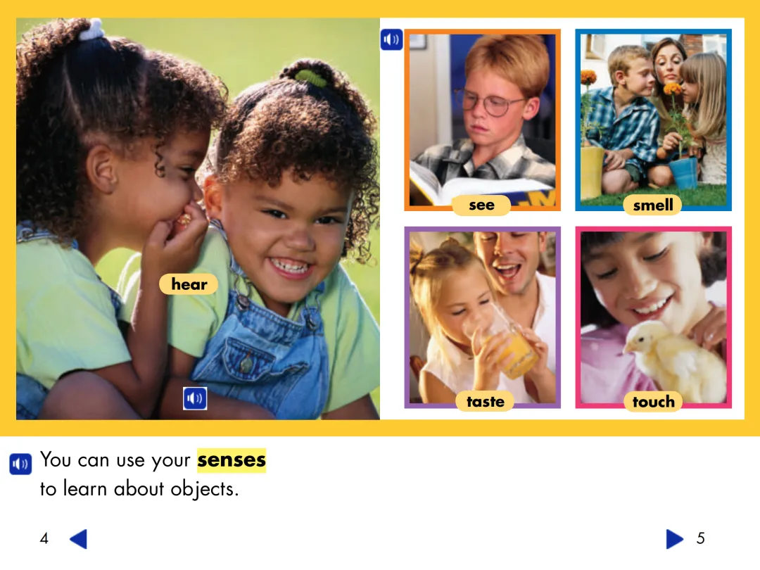 这套专为低龄幼儿设计的幼儿园有声绘本,每一页都巧妙地内置了真人美音朗读音频。孩子们只需简单地点击页面上的小喇叭图标,这些图标通常位于每句话或单词的起始位置,就能立即听到清晰且标准的英语发音。这种设计不仅让学习过程变得生动有趣,还帮助孩子们在视觉与听觉的双重刺激下,更有效地吸收和模仿纯正的英语语音,促进他们的语言发展。