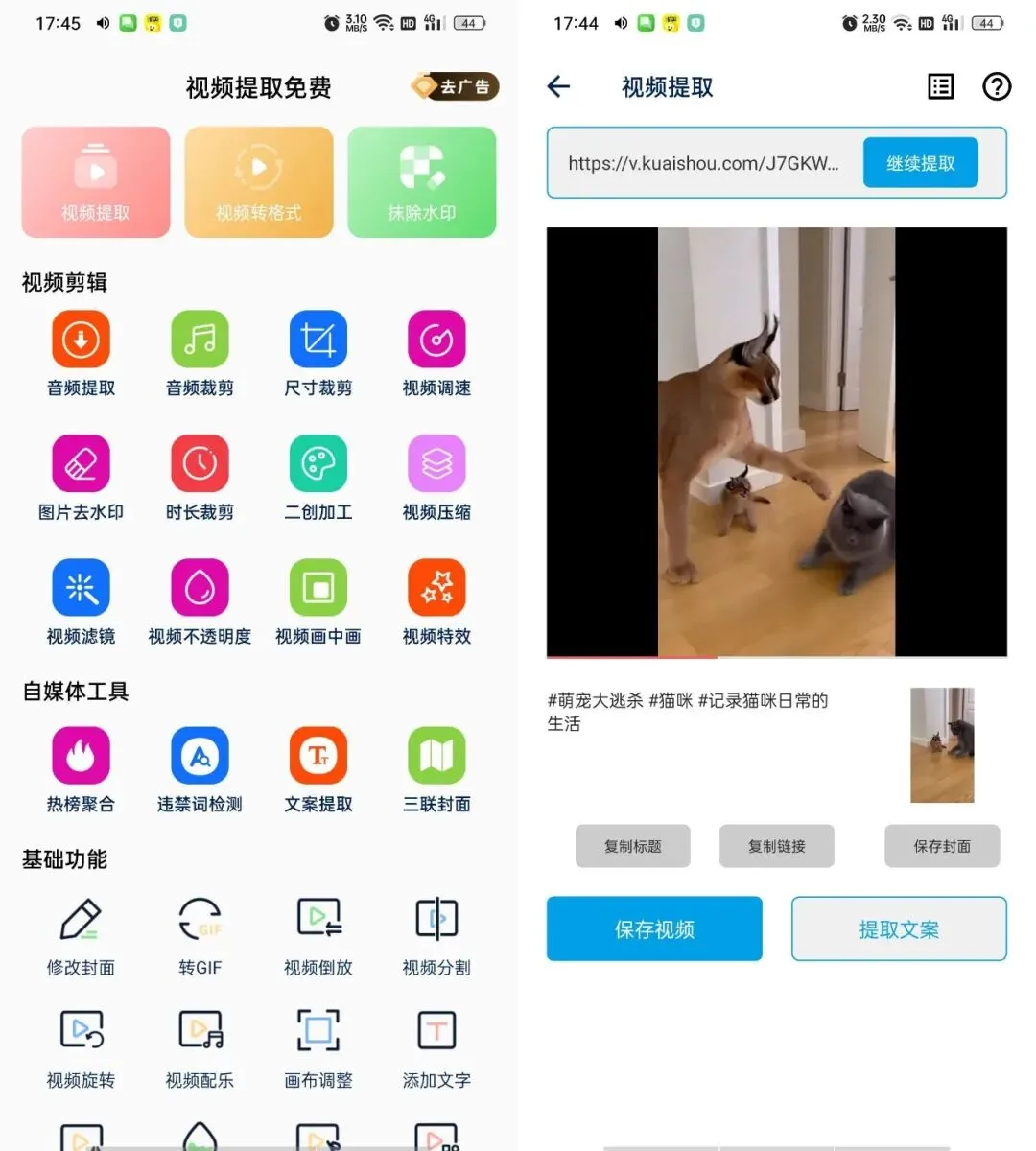 **简介:** 视频提取工具箱是一款简单便捷的视频编辑工具。它提供视频提取、视频转换格式、视频压缩、视频裁剪、视频镜像、视频加水印、视频拼接、视频MD5值修改等一站式服务。其核心特色是支持短视频去水印功能,让用户可以轻松提取无水印视频素材进行二次创作加工。适用于需要从各大短视频平台获取素材并进行创意编辑的内容创作者。