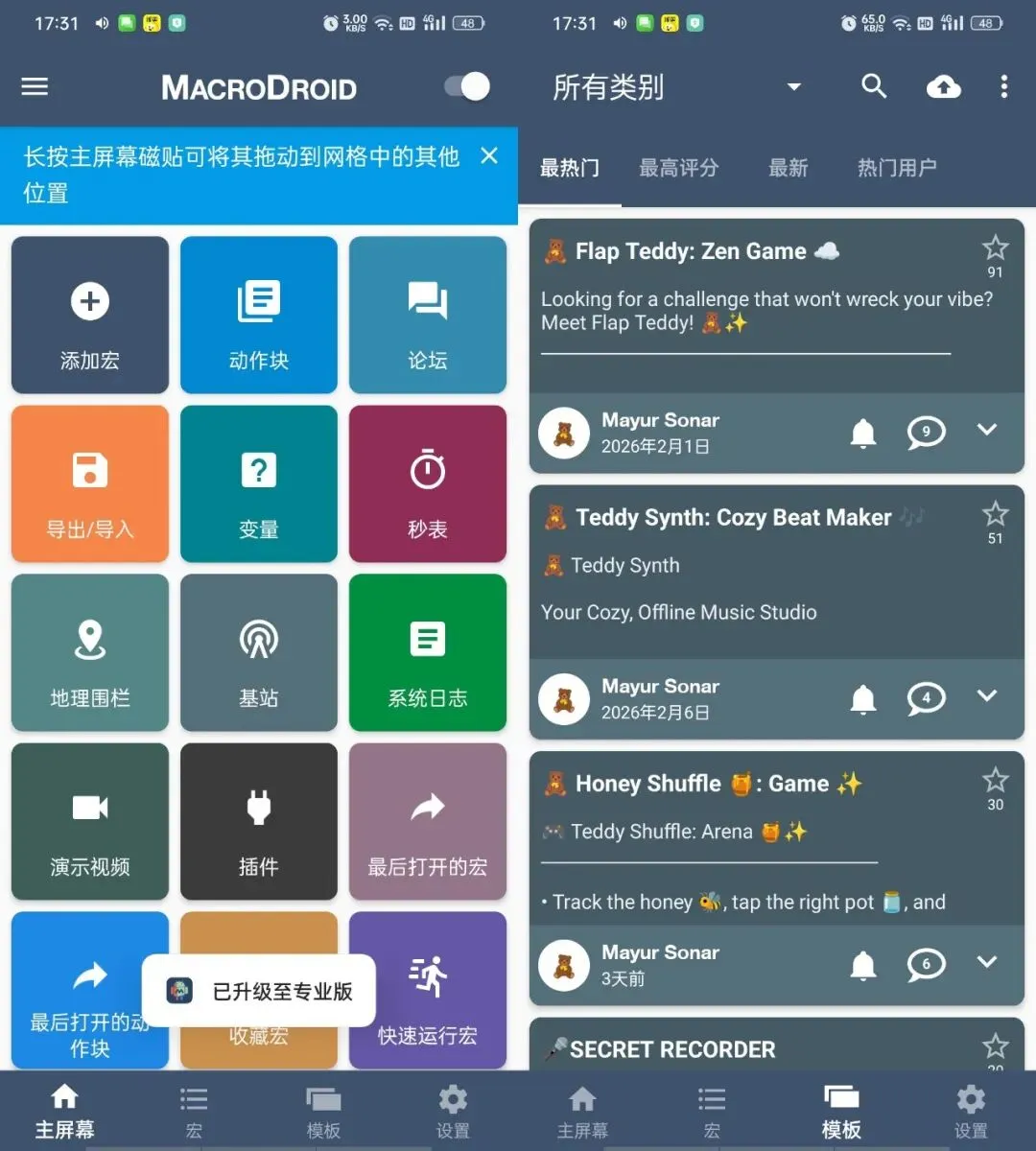 **简介:(小白就别用了,真的有点复杂) MacroDroid是由ARLOSOFT开发的安卓平台领先的自动化应用,拥有超过1000万下载量。它通过直观的界面简化了创建宏的过程,用户可以轻松选择各种触发器、动作和约束条件来定制自动化体验。应用采用彩色编码设计,功能强大,支持社区分享和发现用户生成的模板。它允许用户在基于时间、位置、应用启动等触发条件下自动执行模拟点击、控制设置、发送通知等复杂操作,是移动设备上最专业的自动化解决方案之一。