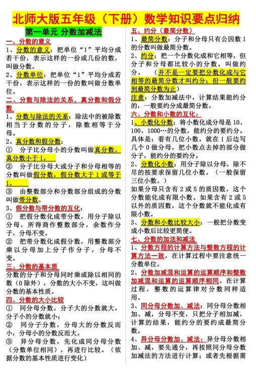 26春五年级寒假预习知识点汇总 北师版 完整电子版可下载打印