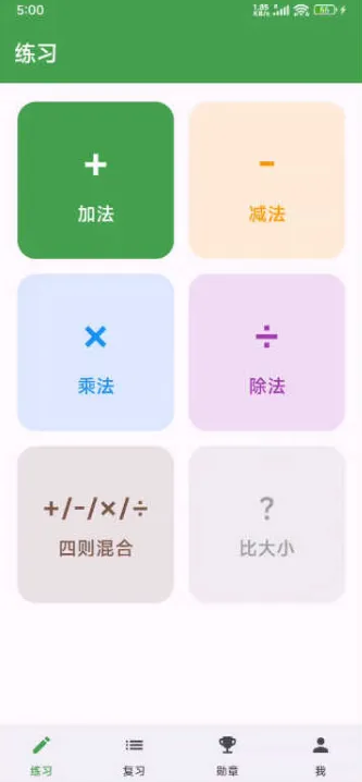 打开App,界面巨简洁,孩子自己就能操作。想练加法点加法,想练乘法点乘法,加减乘除四种模式随便选。难度从1星到5星,对应从10以内到百位数的混合运算,完全可以根据孩子的水平来调整。