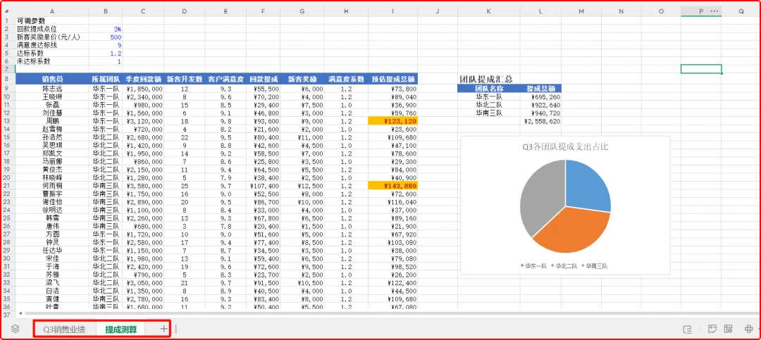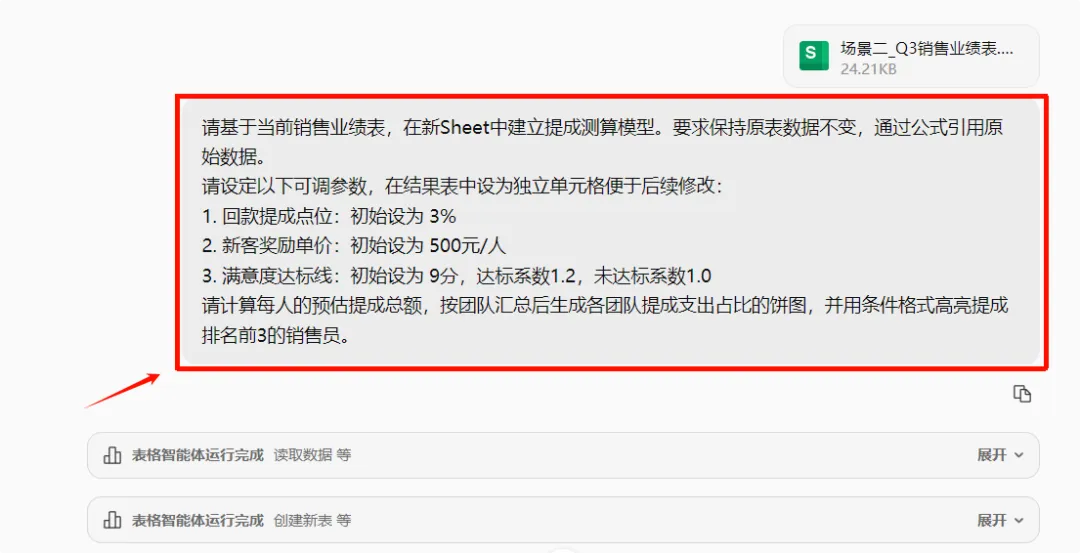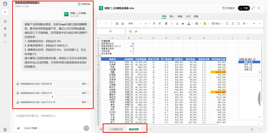 左侧是WPS灵犀的AI对话框,右侧是原数据表,以及智能体根据任务创建的提成测算工作表。