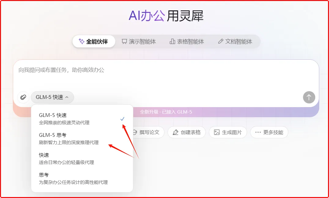 在AI大模型的选择上,接入了GLM-5快速和GLM-思考