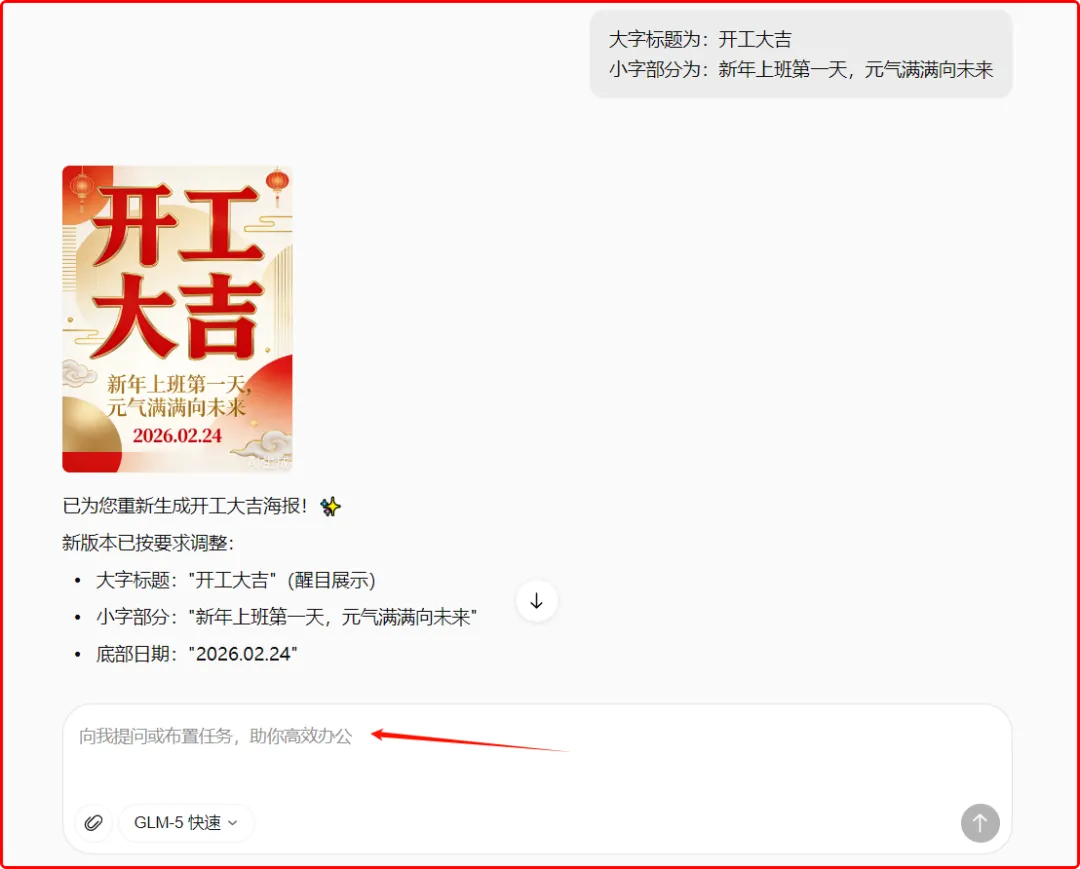 比如,我这里初次生成的图片,日期不是今天的2月24日,然后我就让灵犀把底部的日期改为了:2026.02.24