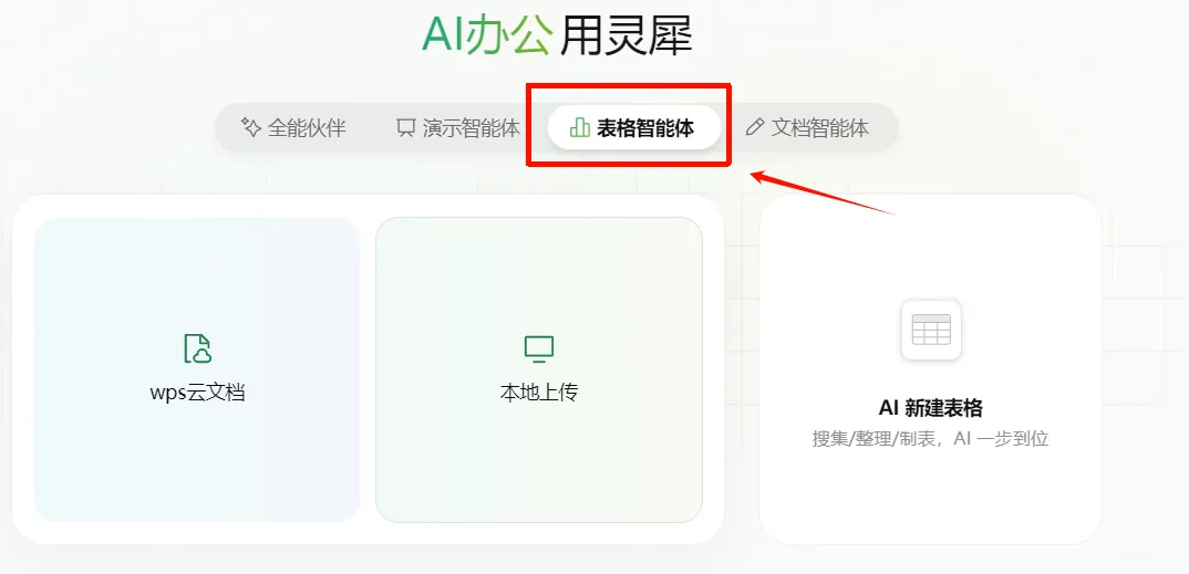 选择【表格智能体】后,上传Excel数据表。可以上传WPS云文档,也可以选择本地上传。