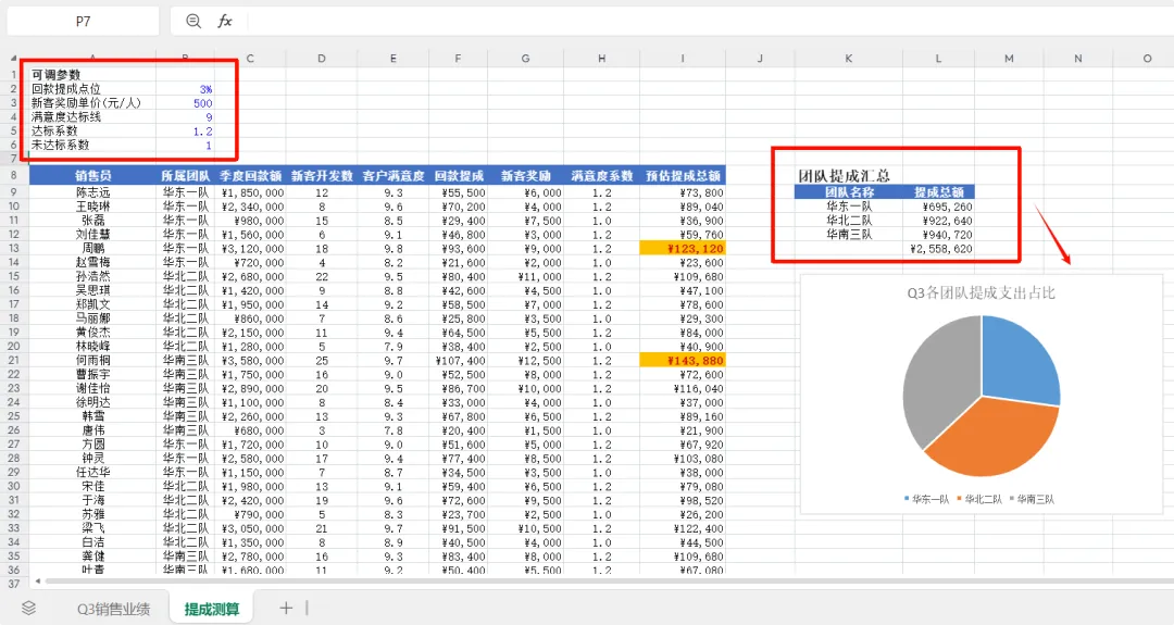 在提出测算工作表里,对原业绩数据进行了数据分析计算,自动生成带公式的列数据、汇总数据,还自动的在表格里生成了数据图表。