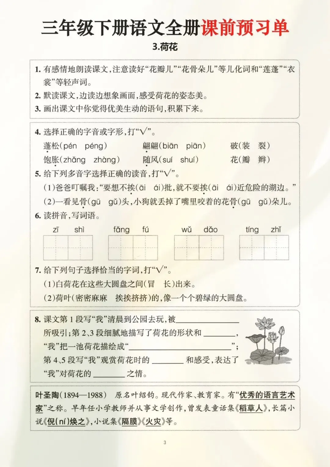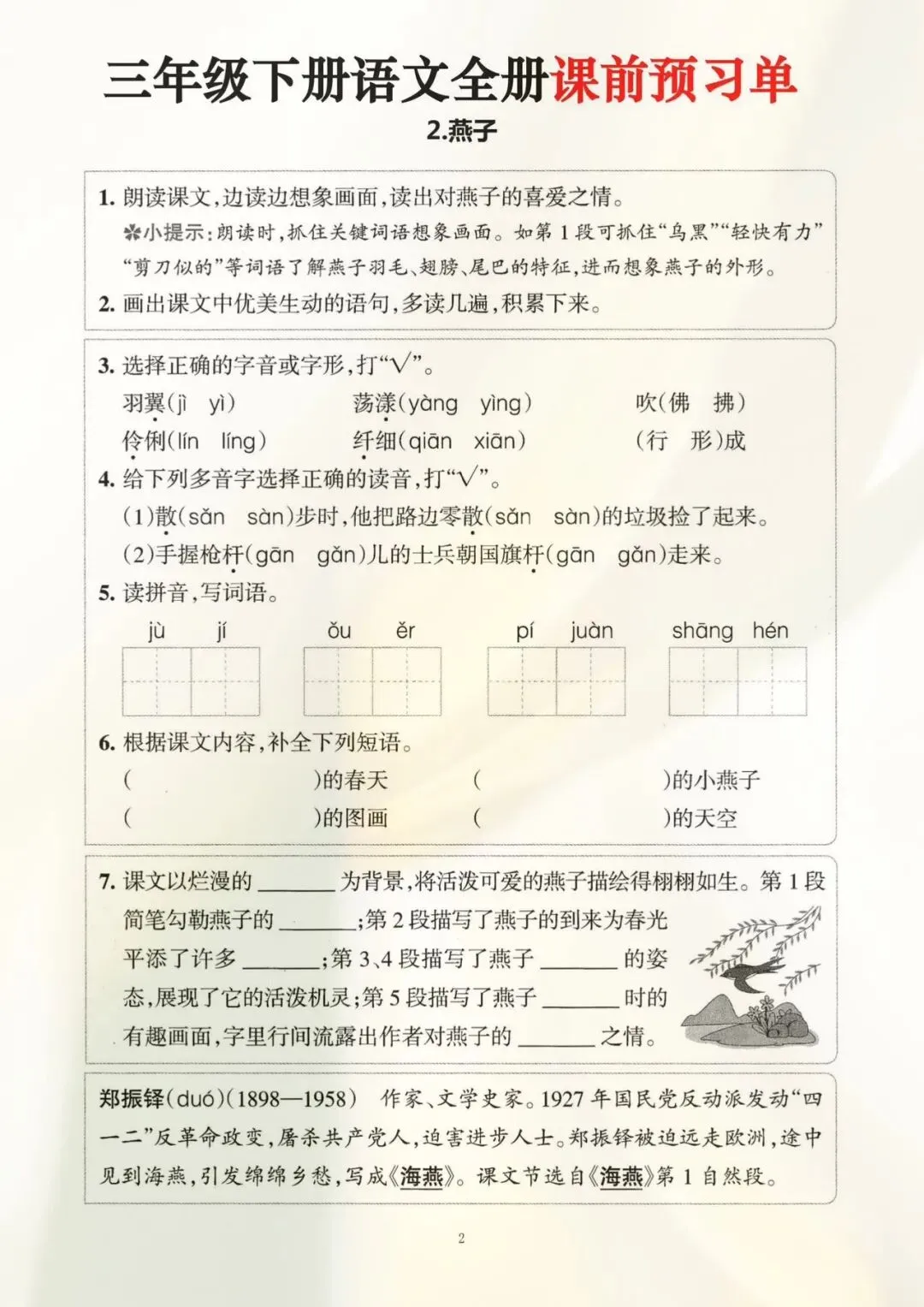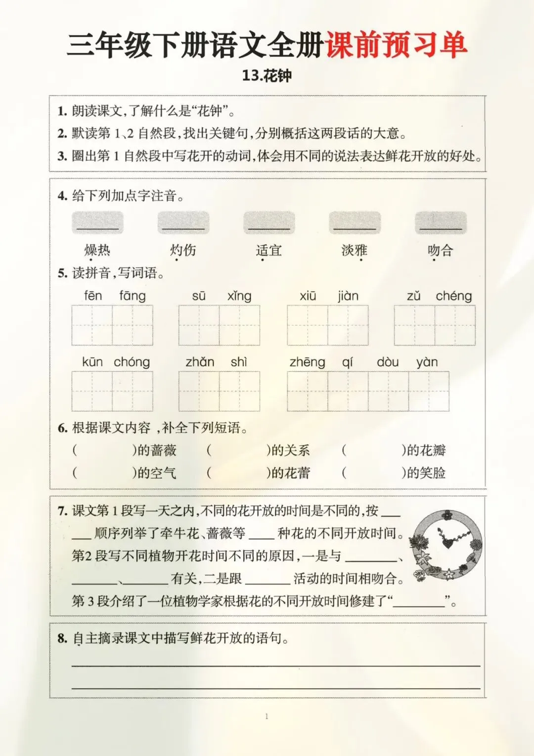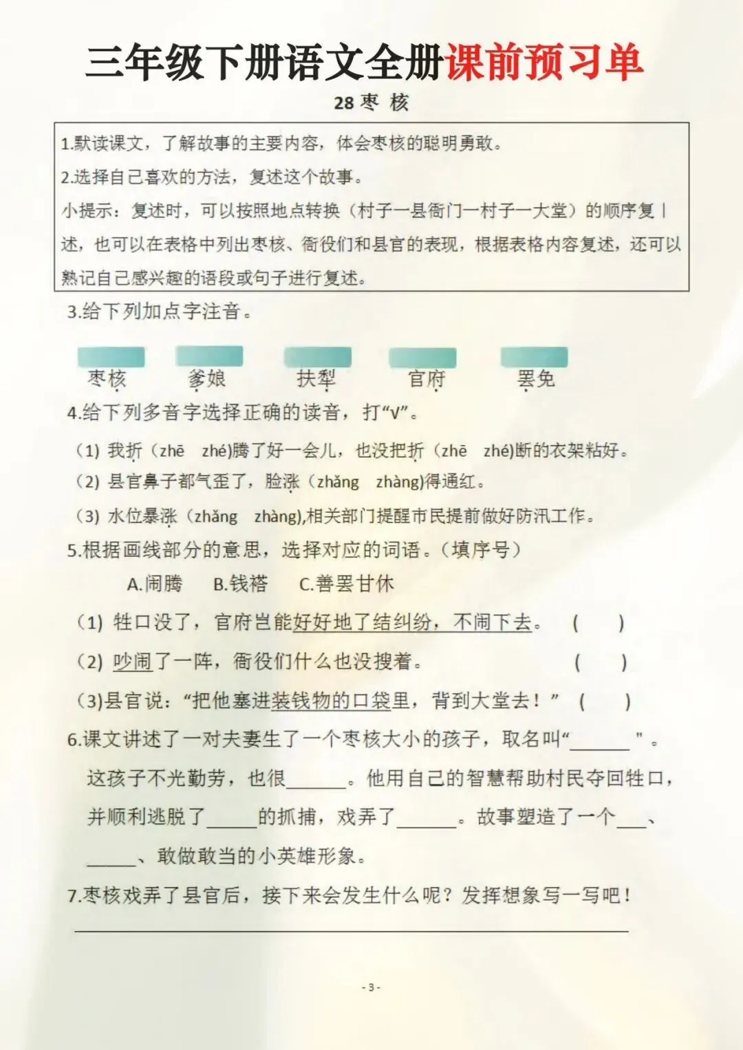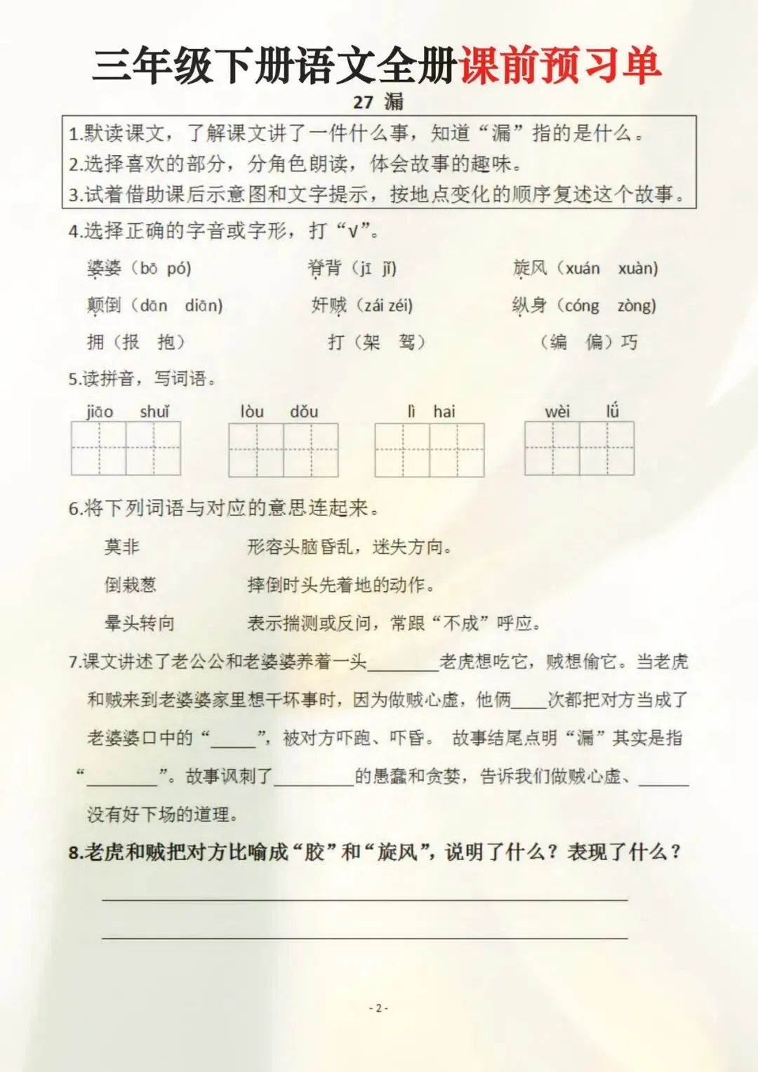 三年级下册语文全册课前预习单(电子版可打印)