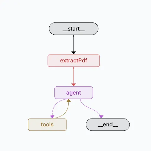 /*src/agent.ts*/import { StateGraph, START, END } from "@langchain/langgraph";import { toolsCondition } from "@langchain/langgraph/prebuilt";import { callModel } from "./nodes/callModel";import { toolNode } from "./nodes/toolNode";import { extractPdf } from "./nodes/extractPdf";import { AgentState } from "./state";const graph = new StateGraph(AgentState).addNode("extractPdf", extractPdf).addNode("agent", callModel).addNode("tools", toolNode).addEdge(START, "extractPdf").addEdge("extractPdf", "agent").addConditionalEdges("agent", toolsCondition, ["tools", END]).addEdge("tools", "agent");export const agentGraph = graph.compile();
