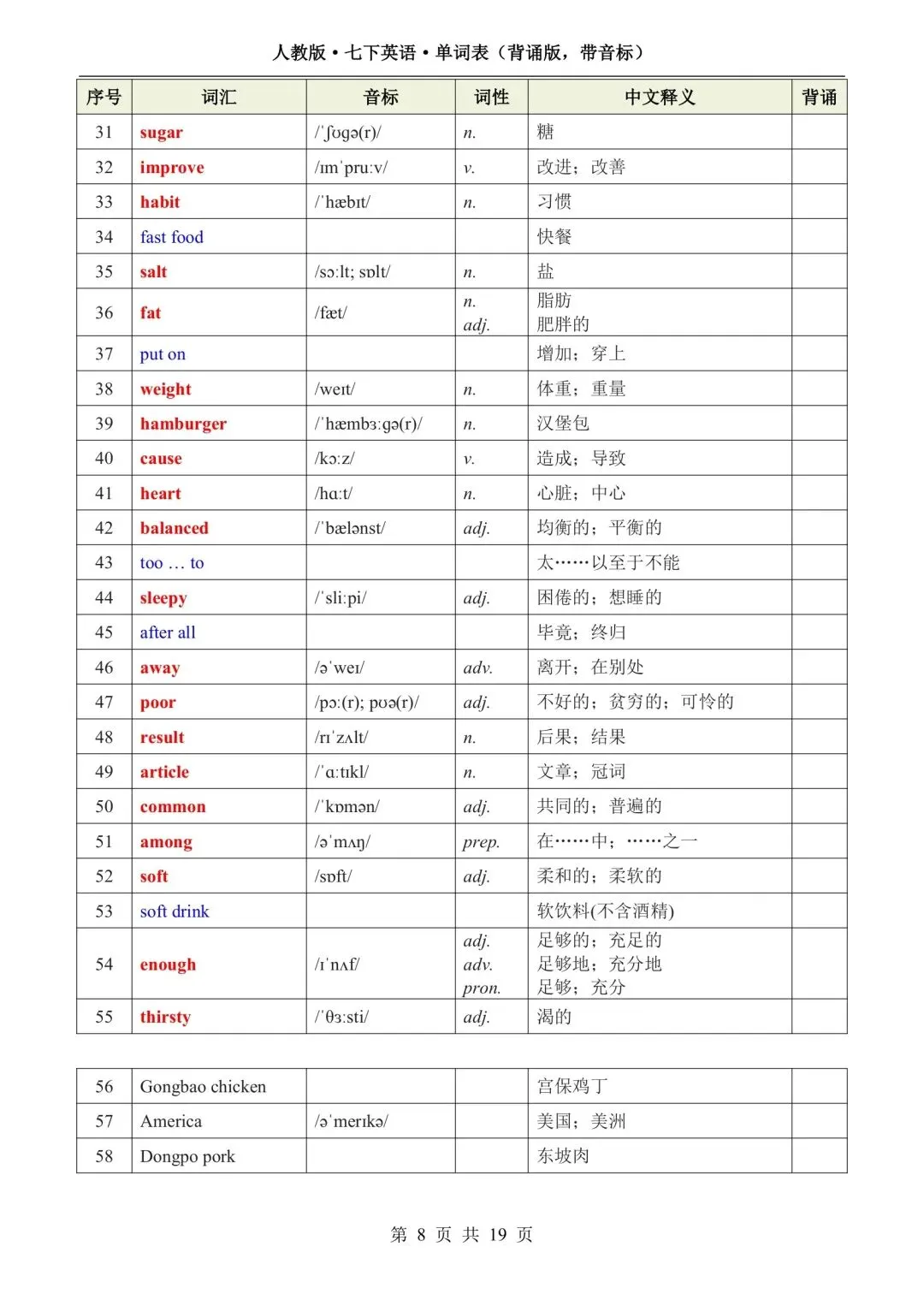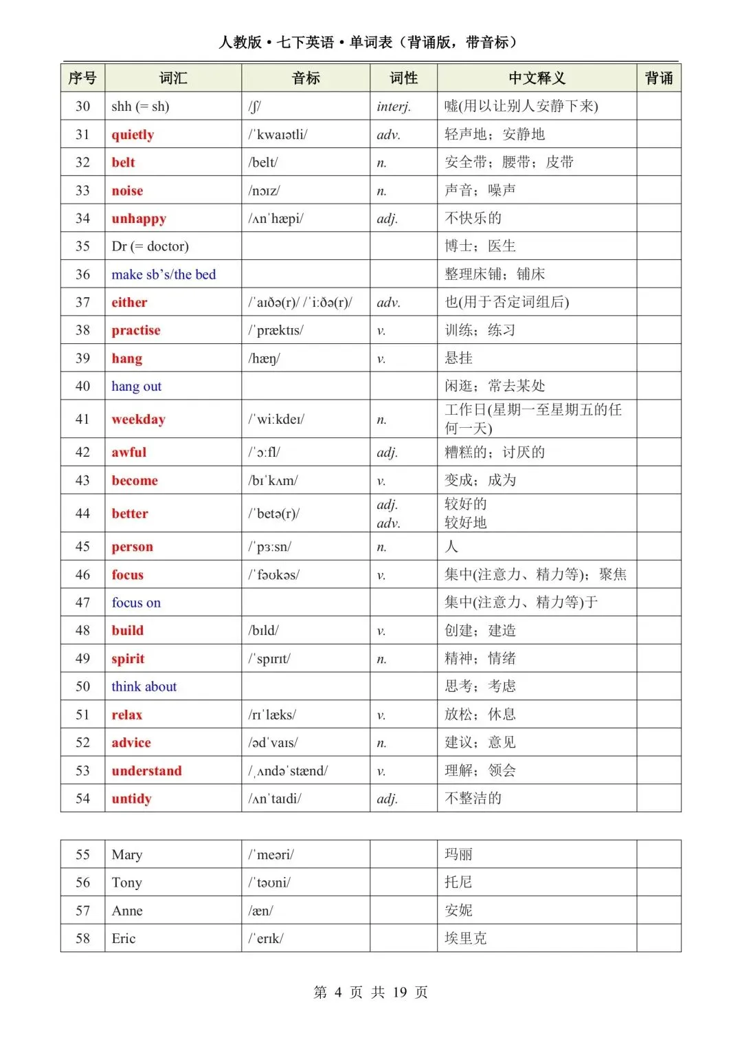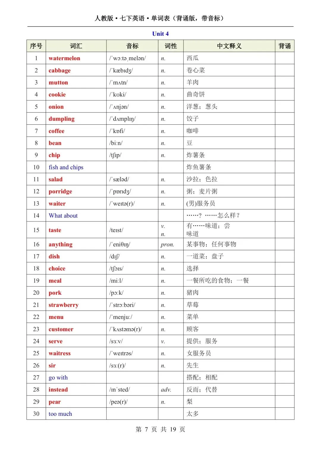新版初一七年级下册人教版英语单词表(背诵版 带音标)高清电子版可打印
