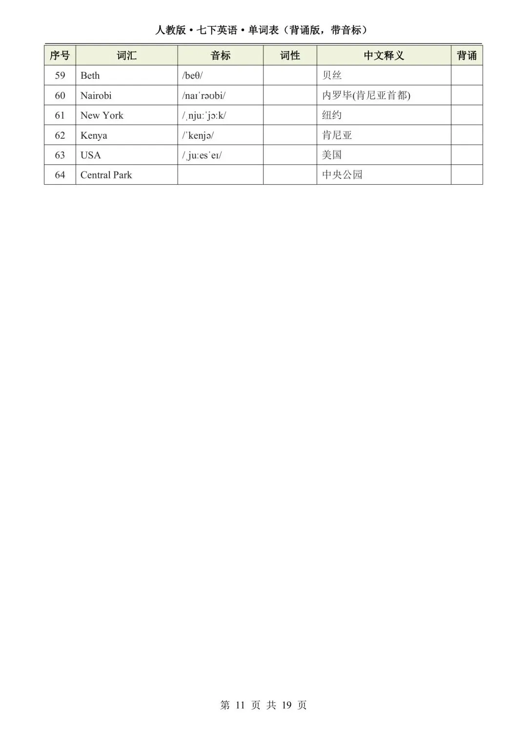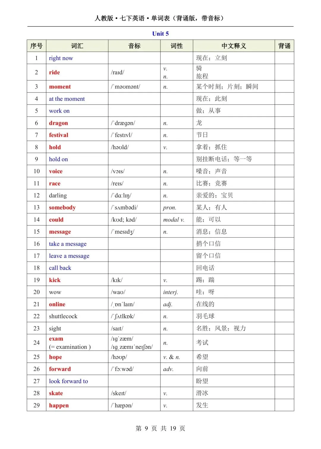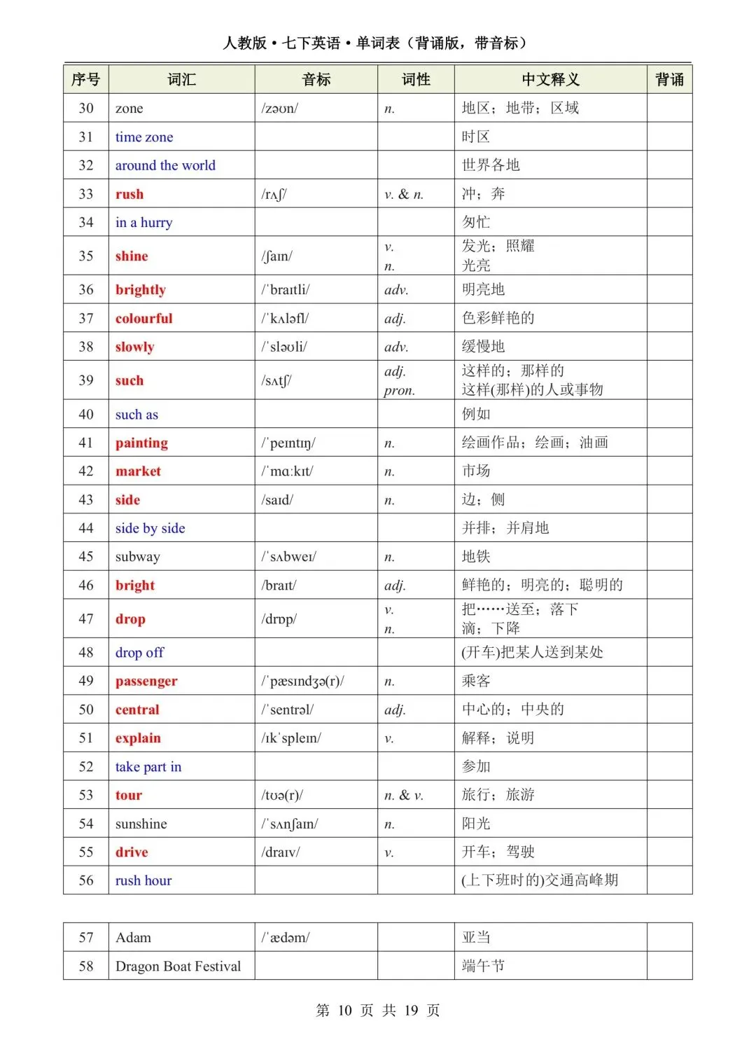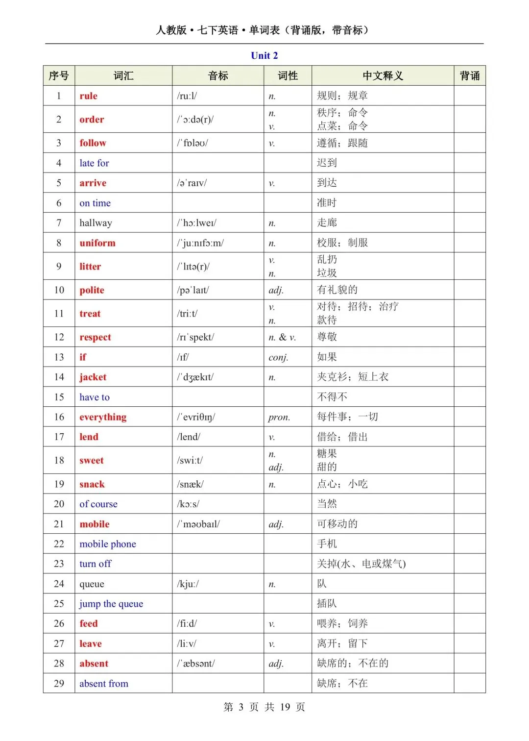 新版初一七年级下册人教版英语单词表(背诵版 带音标)高清电子版可打印