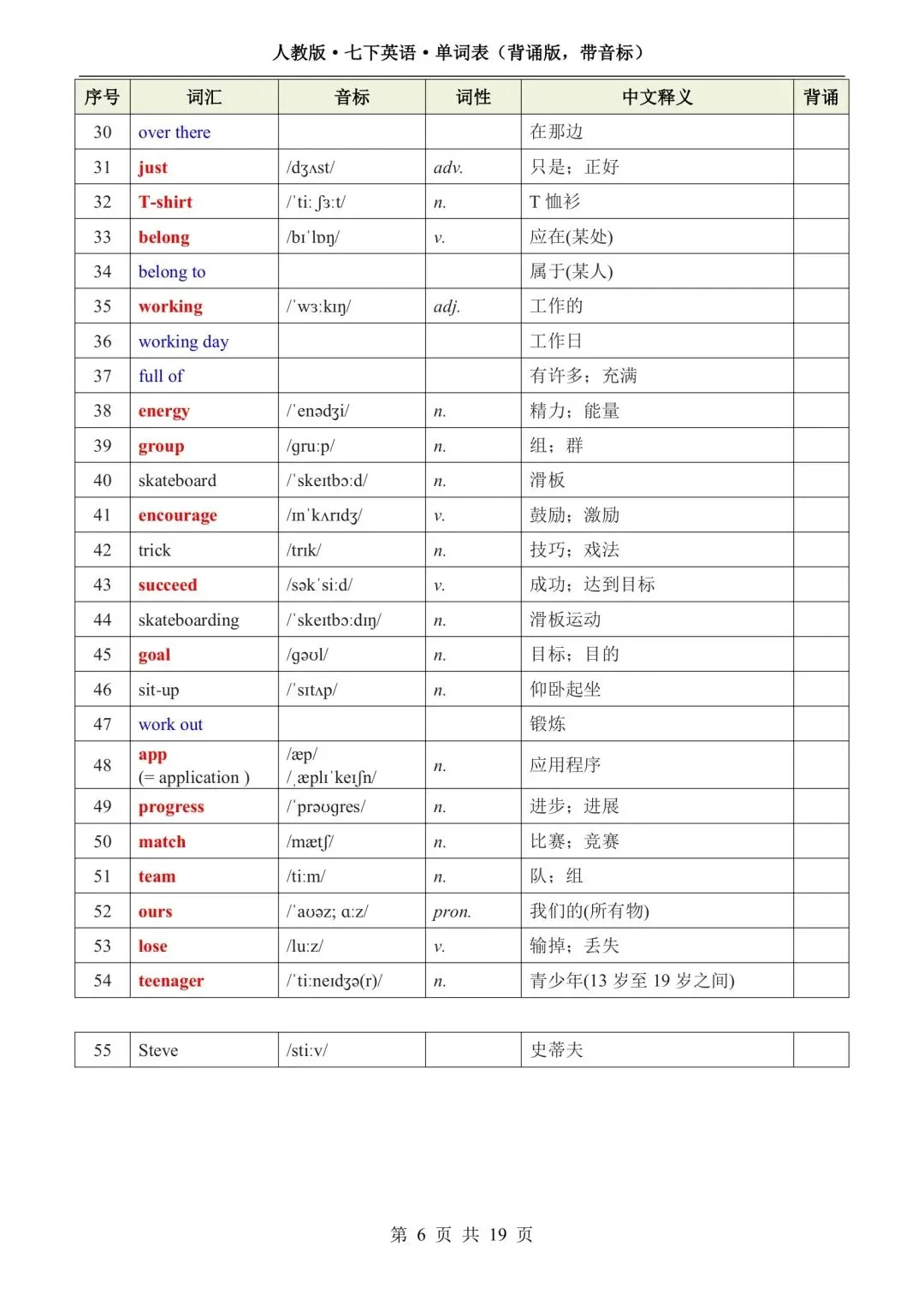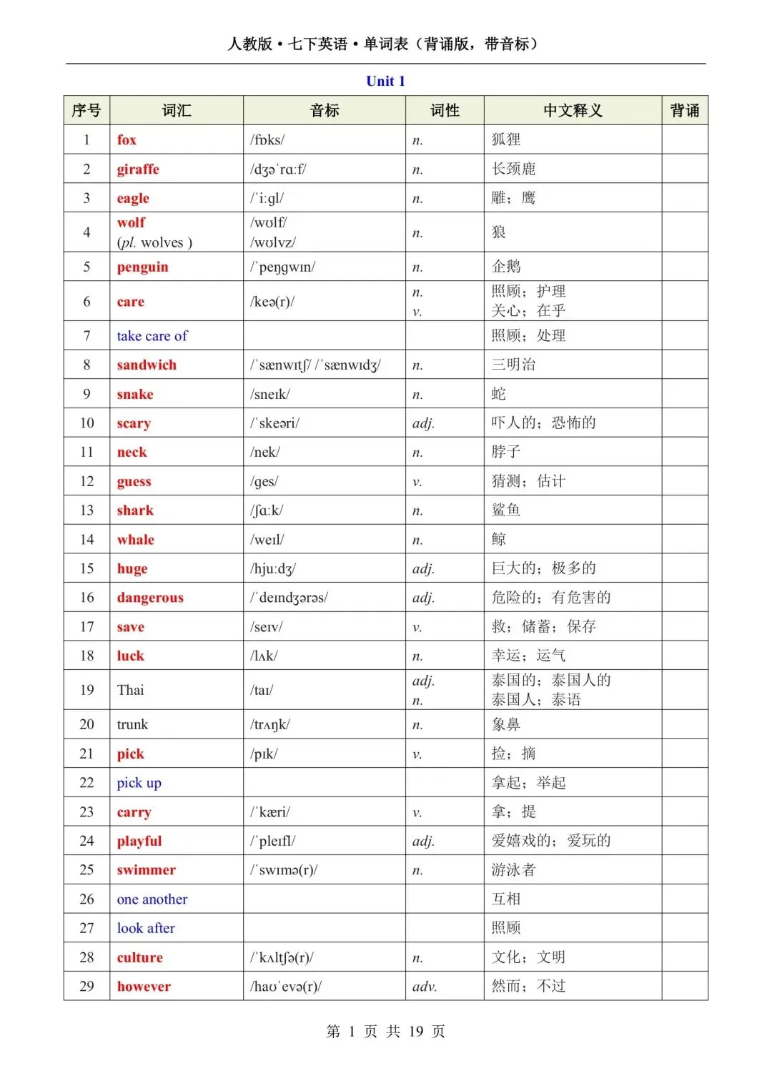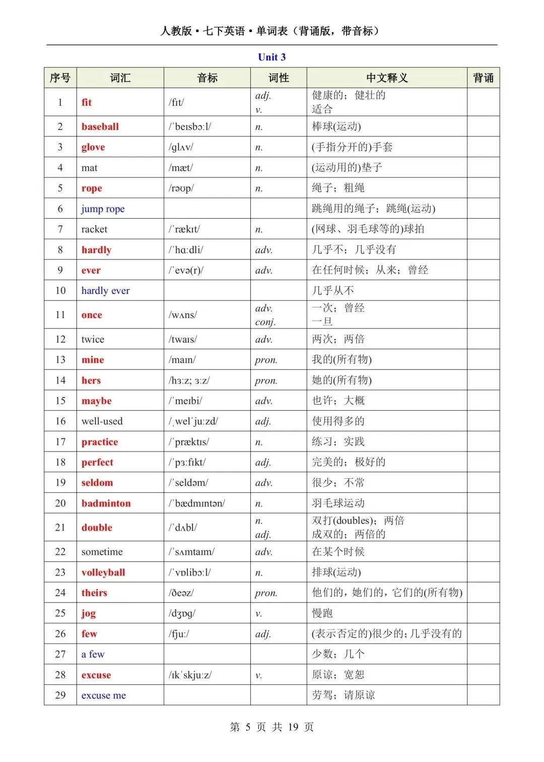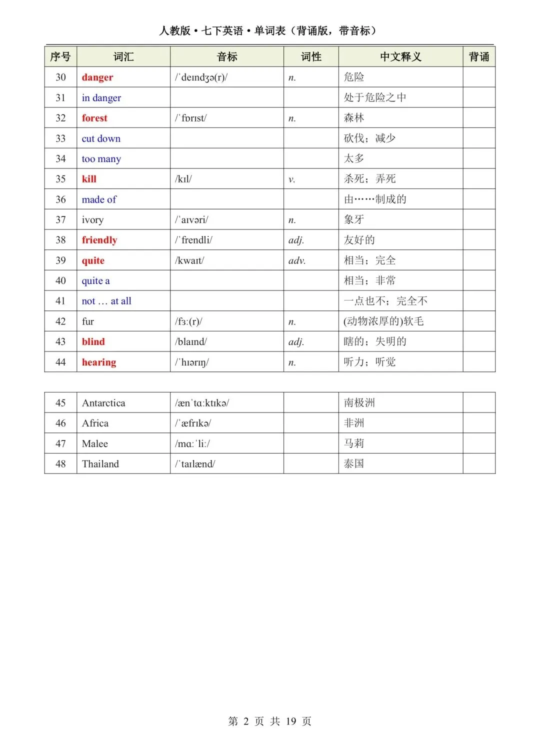 七年级下册人教版英语单词(背诵版 带音标)高清电子版可打印