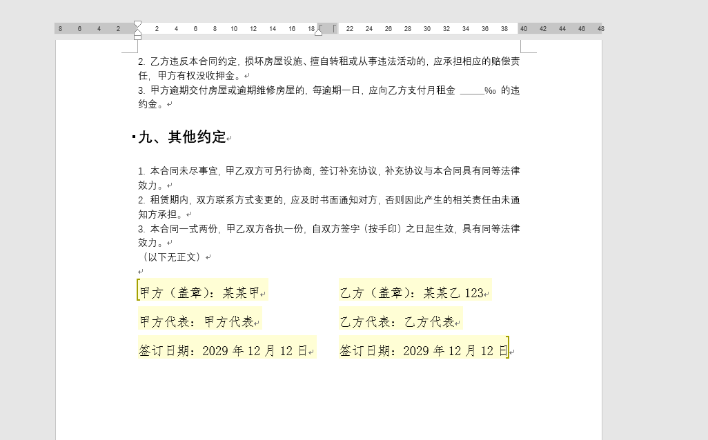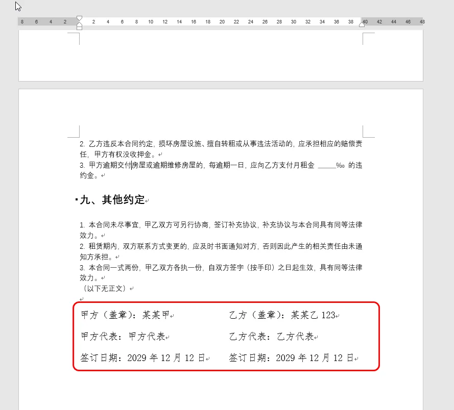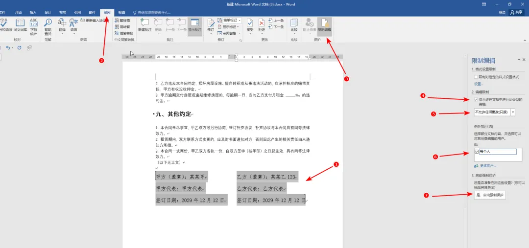 Word中如何防止文档被修改 应用场景:合同中防止被别人修改部分条款,只允许修改签名和日期。 1. 有如下数据,只允许修改签名区域(红色框框住的部分),其他地方不允许修改 2. 操作步骤 2.1 选中允许编辑的文本 2.2 点击“审阅”菜单 2.3 点击“限制编辑”按钮 2.4 勾选“仅允许在文档中进行此类型的编辑”,这个并表示仅让你选中的这段文本成为可编辑区域,文档中未选中的所有内容都会被锁定(只读状态) ,他人只能修改选中的这段文本,无法改动其他任何内容 2.5 选择“不允许任何更改(只读)” 2.6 勾选“每个人” 2.7 点击“是,启动强制保护”按钮 2.8 在弹出的“启动强制保护”中输入密码,最好给一个比较复杂的密码,防止被猜中 2.9 可以看到黄色区域可以插入数字,而受密码保护的部分不能编辑,不能新增。