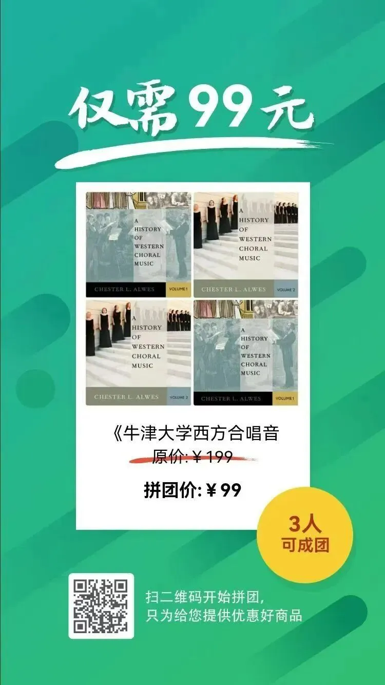 📚《牛津大学西方合唱音乐史》(第一卷&第二卷)中文参考版+英文官方版+中英文对照电子版,优惠拼团请点击阅读原文或扫码下图二维码(拼团马上发放,请添加客服微信:bwv618):