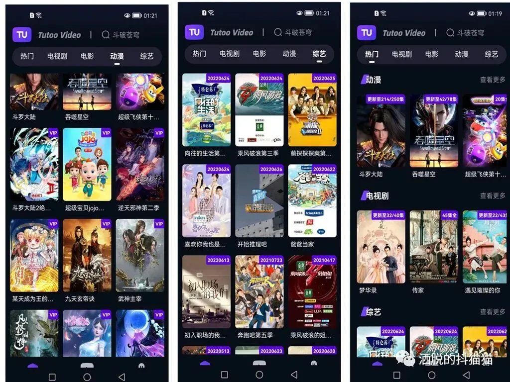 首页最上面是搜索功能,有热门,电影,电视剧,动漫和综艺板块