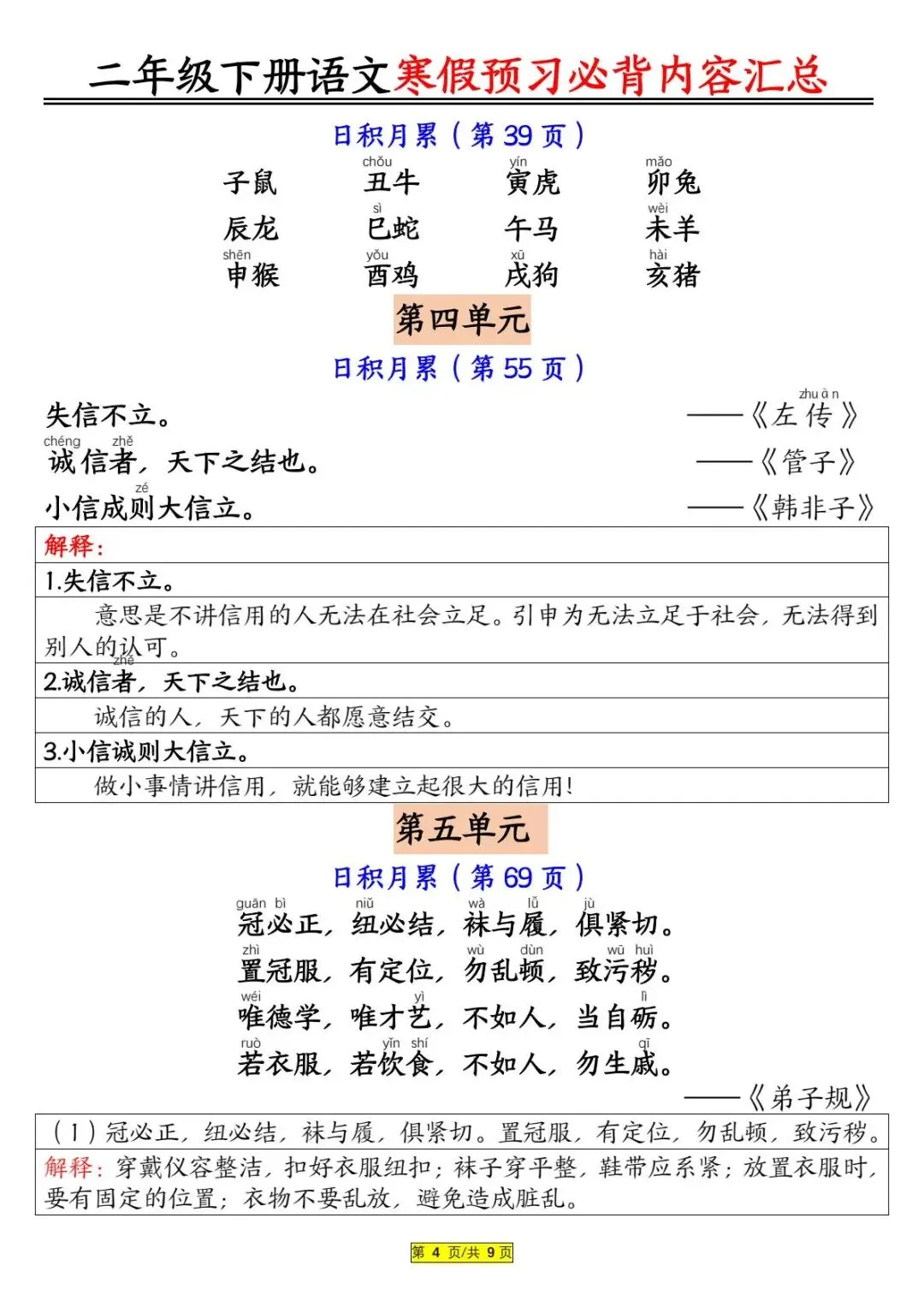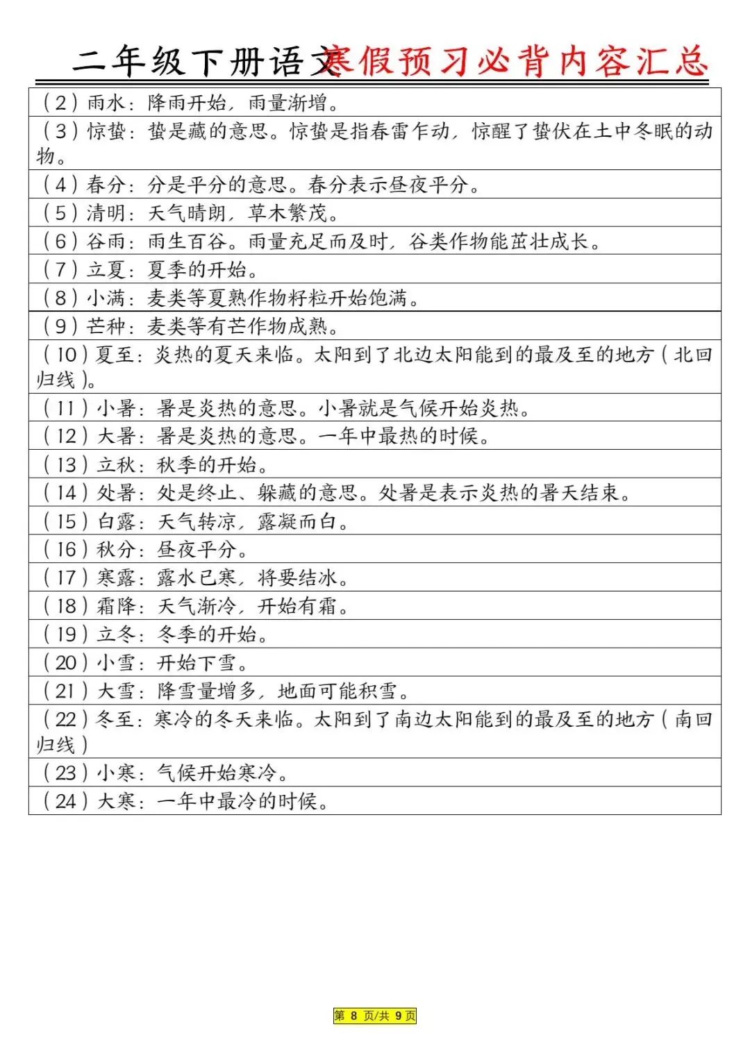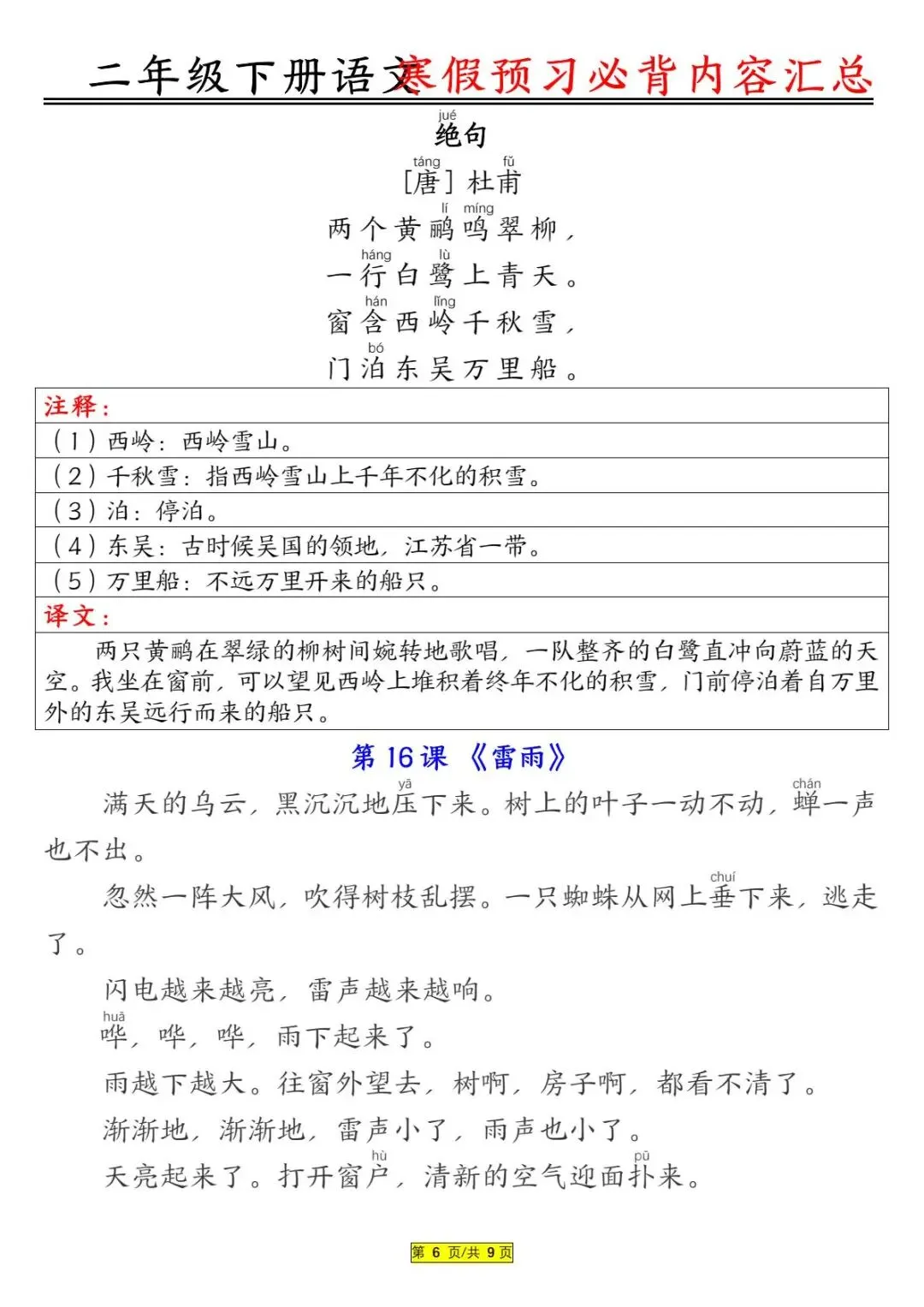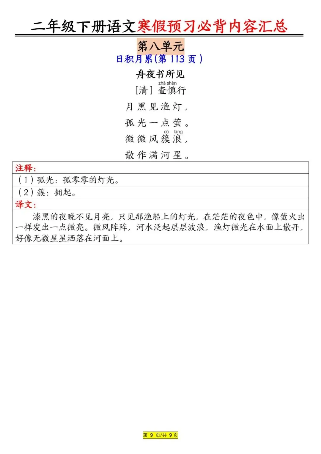 🔥🔥今日分享新版教材 | 2026春 二年级下册人教部编版语文《课文必背内容汇总》9页(含古诗词、文言文、译文、注释、课内必背、日积月累);高清电子版可打印。有需要的家长替孩子收藏和抓紧领取一份打印出来🖨️给孩子练一练吧✍欢迎转发分享到班群或朋友圈,方便家长打印出来助力孩子高效学习不丢分!