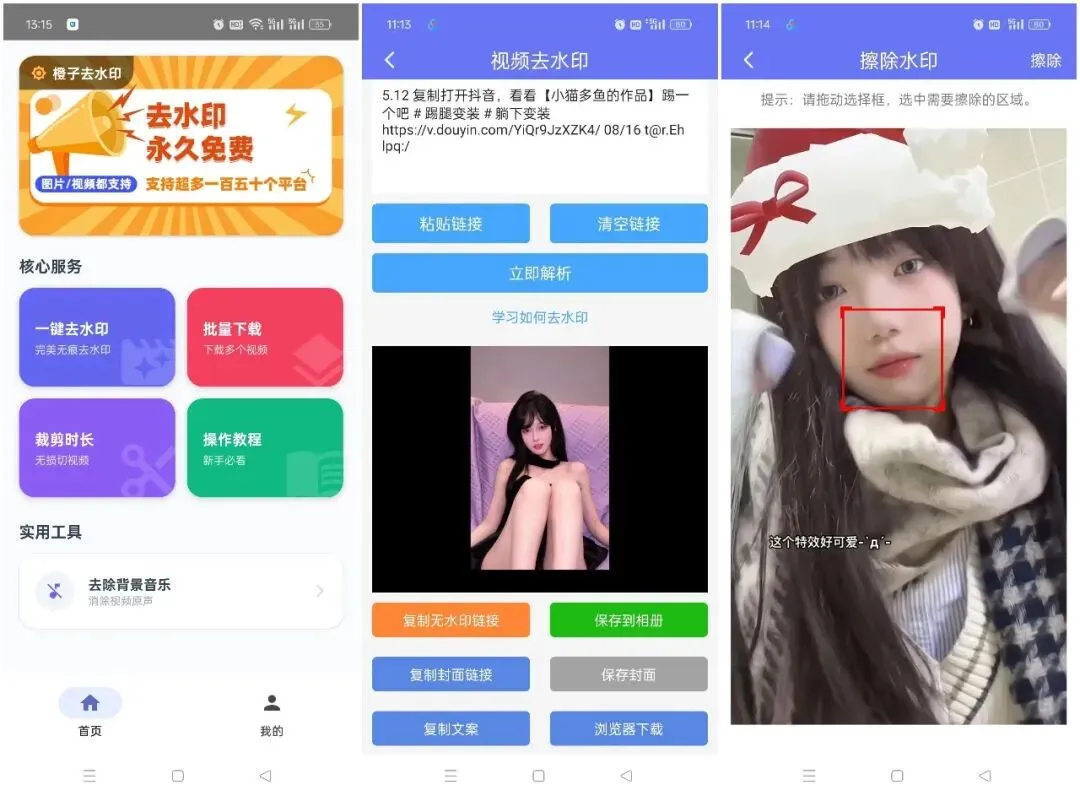 七、短视频去水印支持一键解析提取无水印视频;支持抹除水印,多种视频裁剪编辑功能,以及视频特效滤镜等!视频提取解析、图片去水印、抹除水印、视频裁剪尺寸、视频剪辑时长、视频拼接、视频变速播放、视频倒放、视频画面旋转、视频镜像翻转、视频滤镜等,多种功能免费提供!操作简洁:视频去水印:“抹除水印”操作,准确调节白色操作框环绕住水印,选定哪里消除哪里