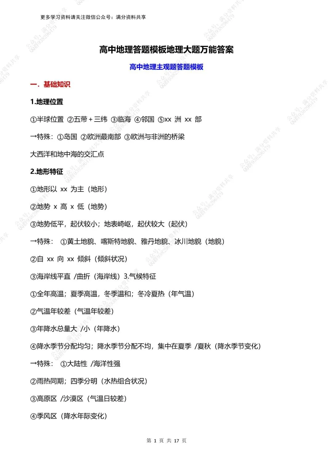 高中地理答题模板地理大题万能答案(pdf分享) 点击图片可观看高清版,文末有获取打印版方式 (完整版17页,部分展示) 领取完整电子版: ①:点一点右下角的“赞”和“在看”,感谢! ②:点击“关注”回复“高中资料”获取资料 点击下方“公众号”关注,可以进入主页哦!