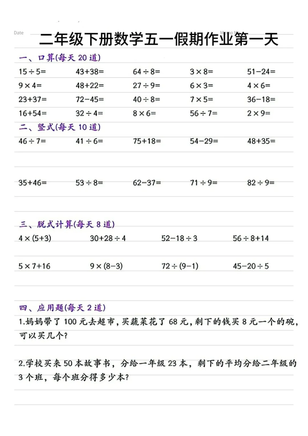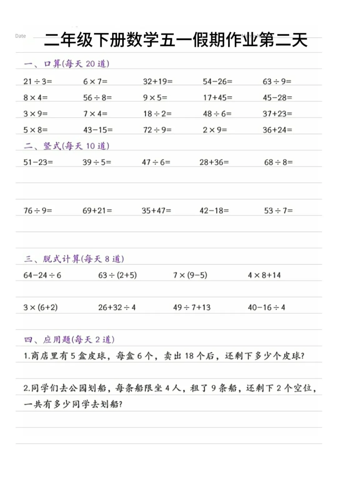 【免费下载】二年级(下)数学 五一假期作业1,PDF电子版,共5页,可打印