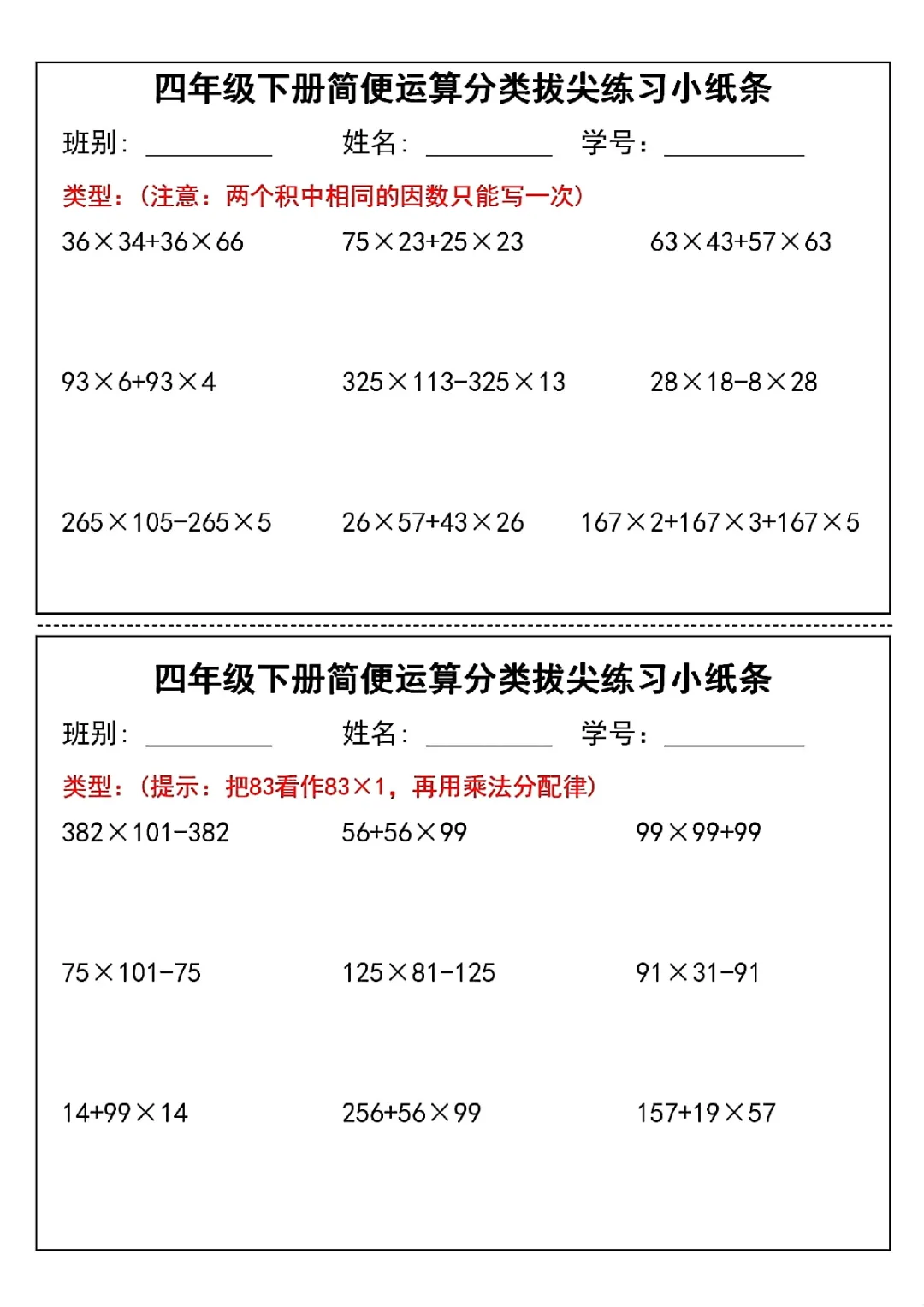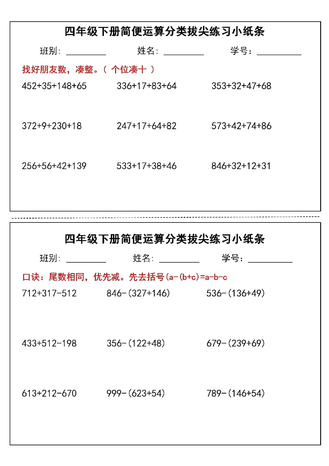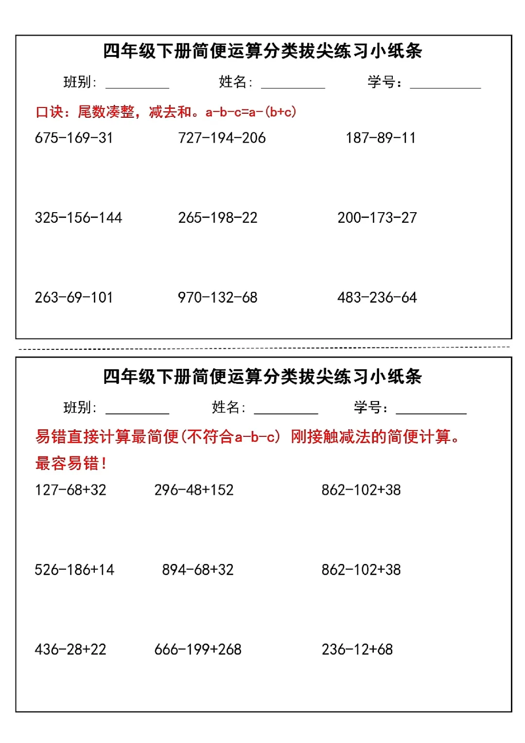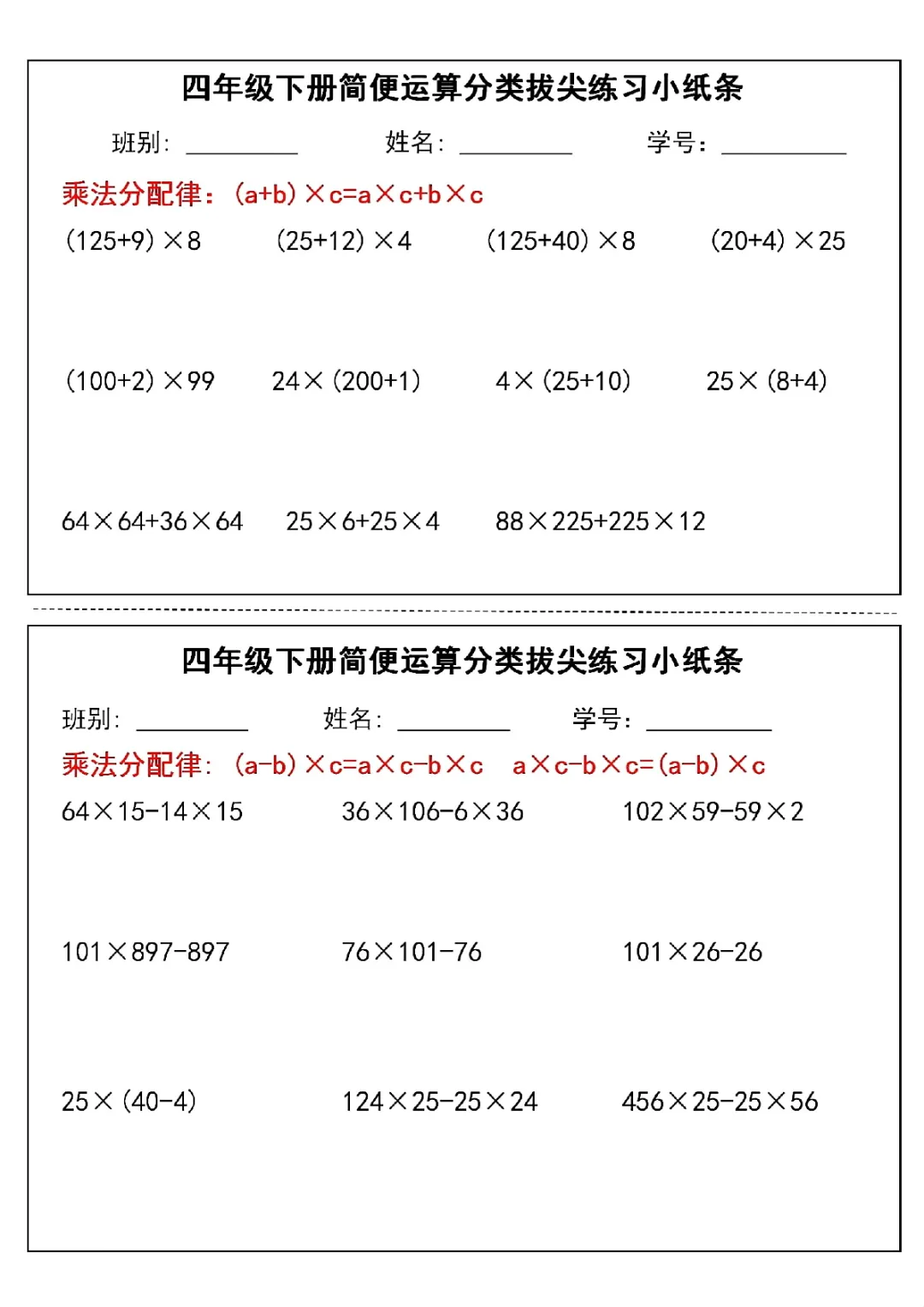 2026年四年级下册数学简便运算小纸条|电子版可打印