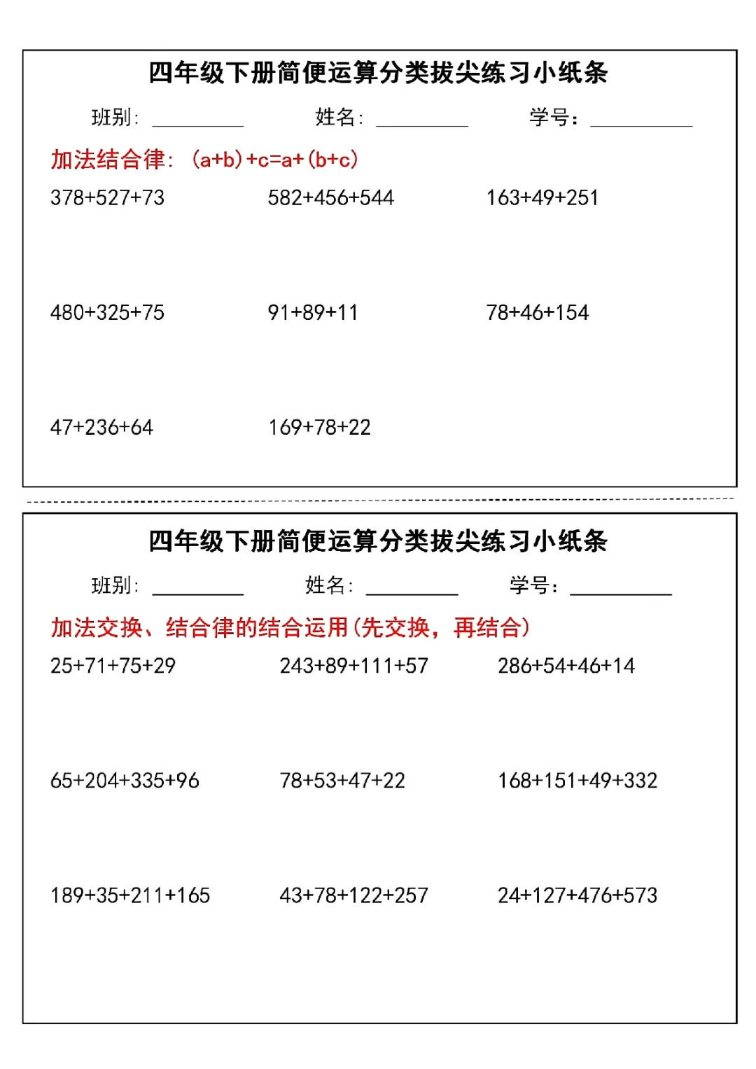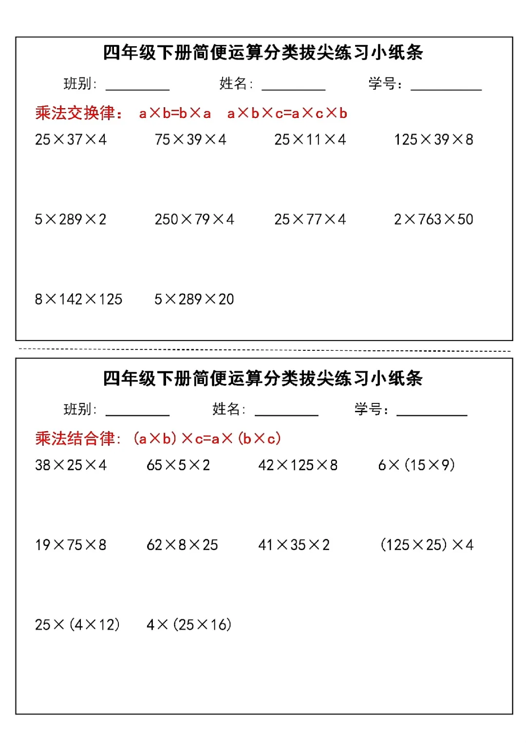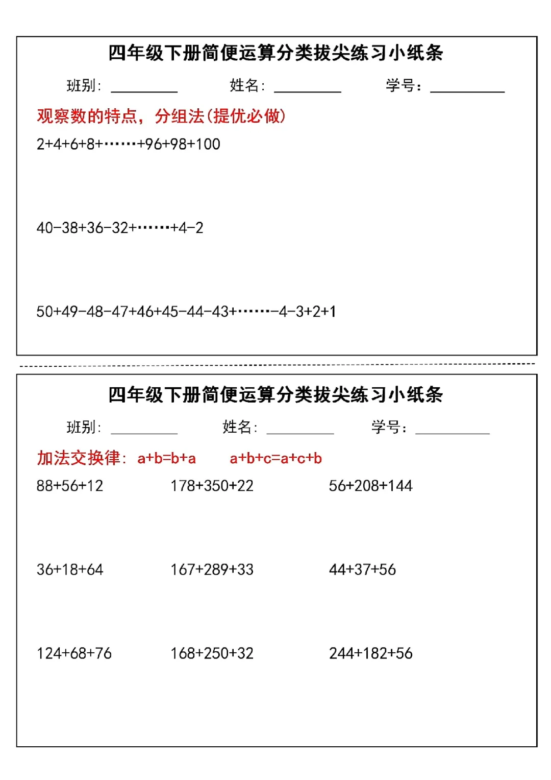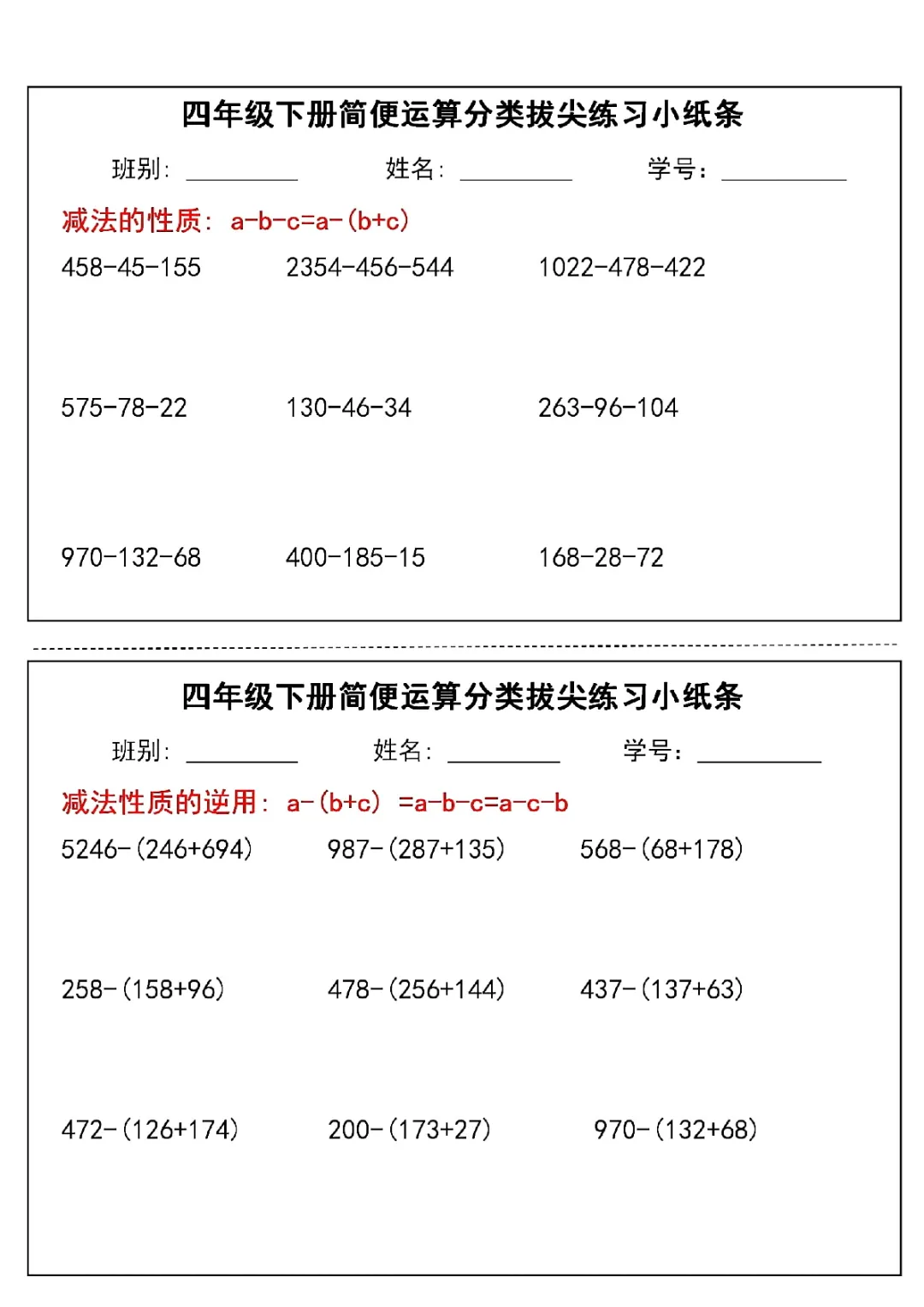2026年四年级下册数学简便运算小纸条|电子版可打印
