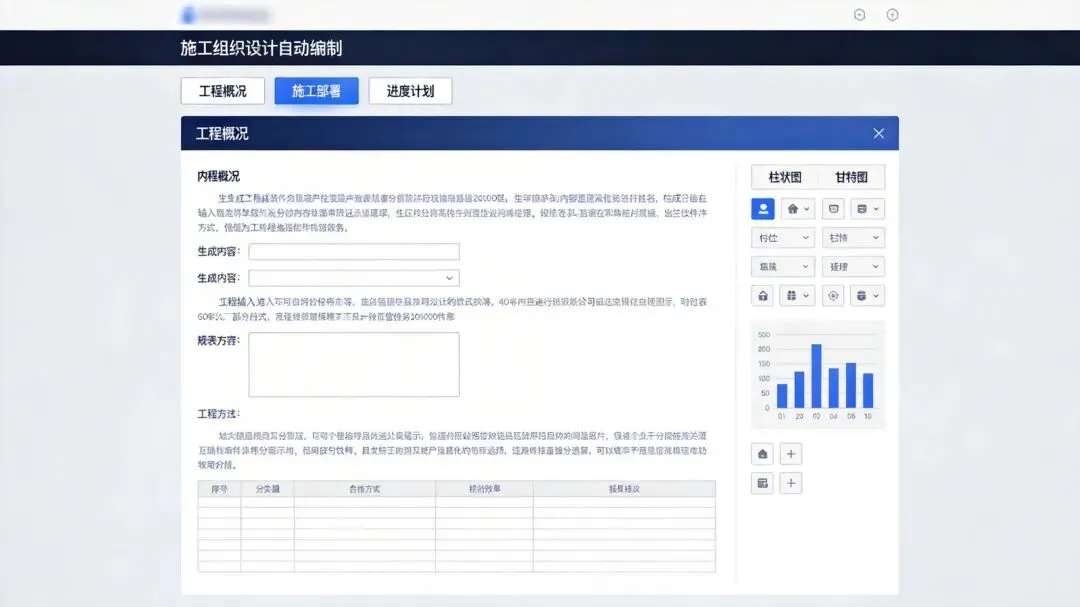施工组织设计自动编制界面:工程概况、施工部署、进度计划智能生成