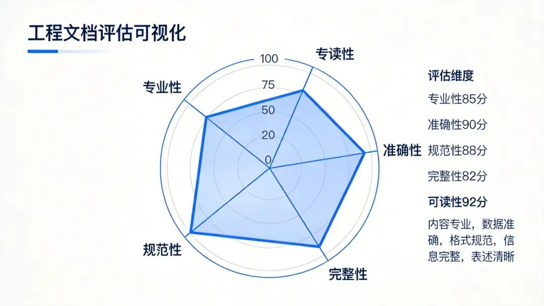 工程中文文档质量雷达图:文档在专业性、准确性、规范性、完整性、可读性等维度的评分