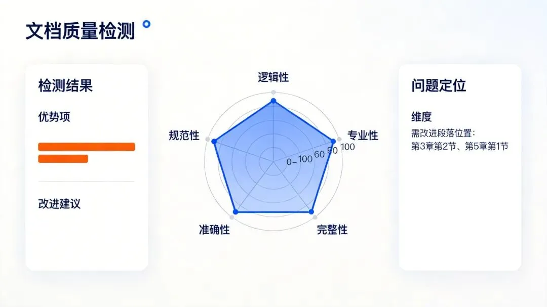 文档质量智能检测:对技术文档的质量评估,包含逻辑性、专业性、完整性等维度评分