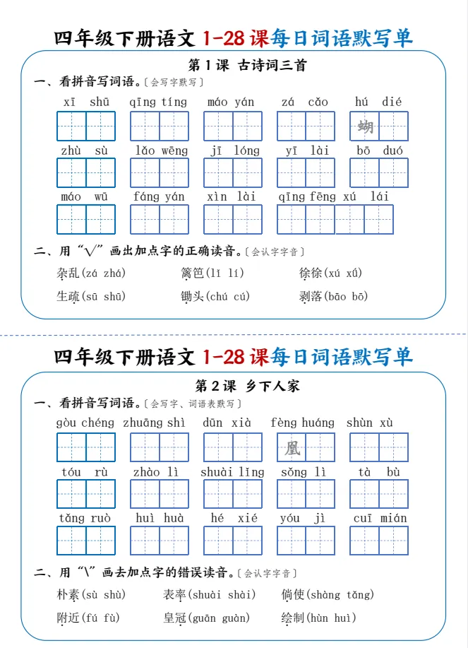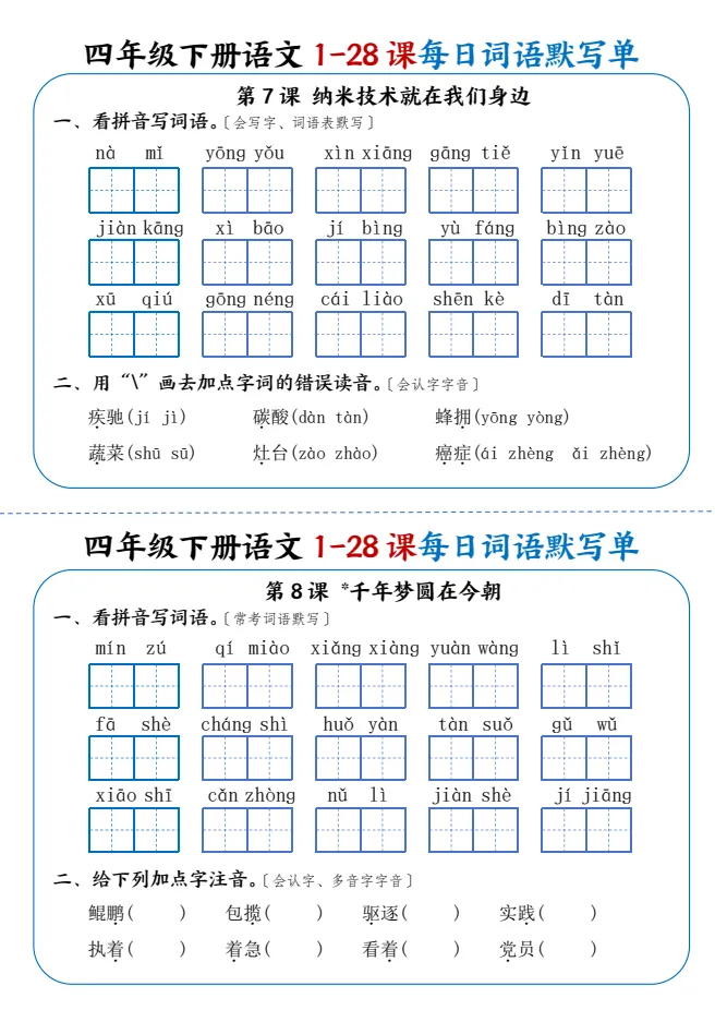 26年春人教新版四年级下册语文每日词语默写单,电子版可打印可下载,这份四下语文每日词语默写单,贴合1-8单元每日学习进度,涵盖了每课重点词语、易错词语、多音字组词、形近字组词、近义词反义词默写等内容,同步衔接课本,帮助孩子每日巩固词语基础,规范书写,规避易错点,夯实语文基础,轻松应对每日默写练习与单元检测。需要的家长抓紧打印出来,让孩子每日坚持默写、巩固提升吧。
