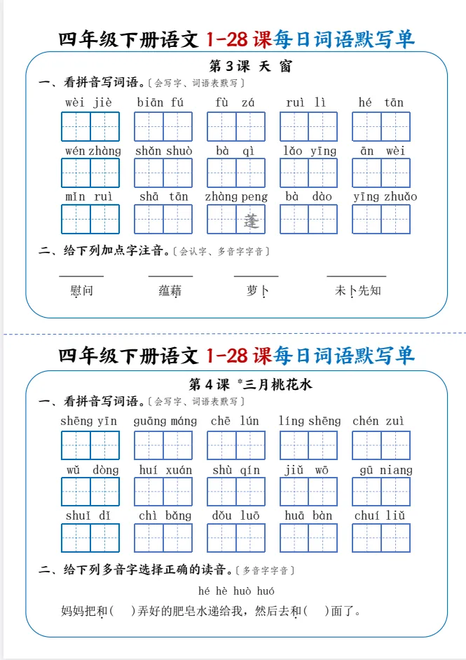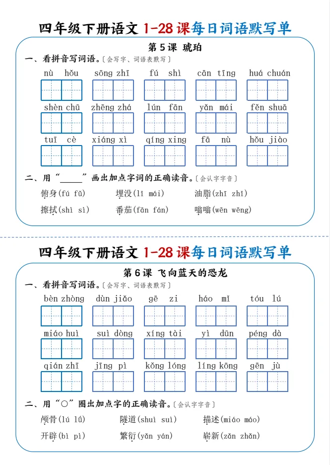 26年春四年级下册语文每日词语默写单(电子版可打印文末付可领取链接)