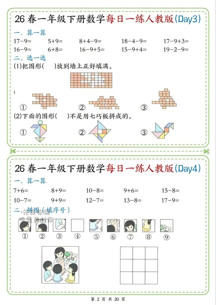 这份一年级下册数学练习贴合人教版,每天的题量适中,先练加减法计算打基础,再搭配图形认识、拼组的题,还有简单应用题,由浅入深,特别适合孩子每天课后做一点,巩固课堂知识。