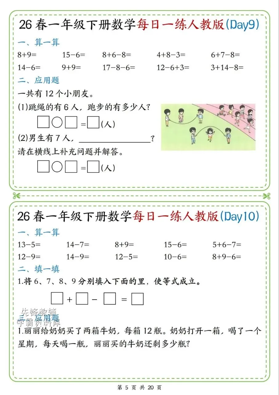 这份一年级下册数学练习贴合人教版,每天的题量适中,先练加减法计算打基础,再搭配图形认识、拼组的题,还有简单应用题,由浅入深,特别适合孩子每天课后做一点,巩固课堂知识。