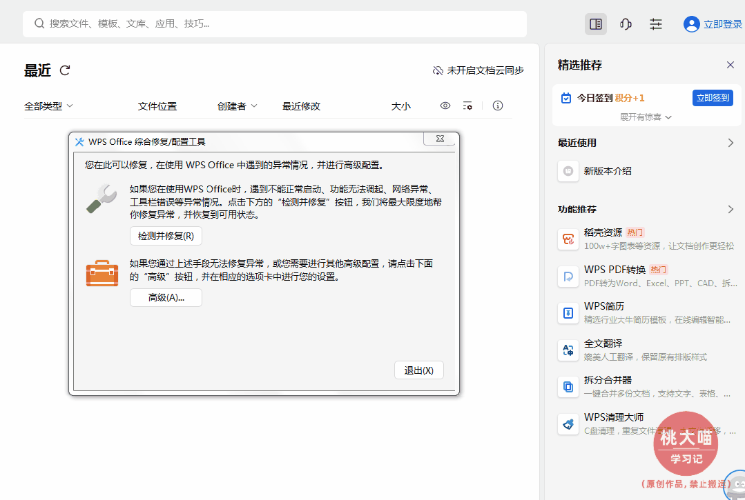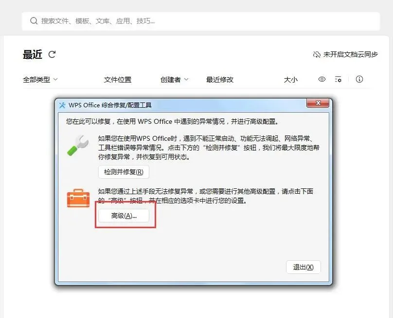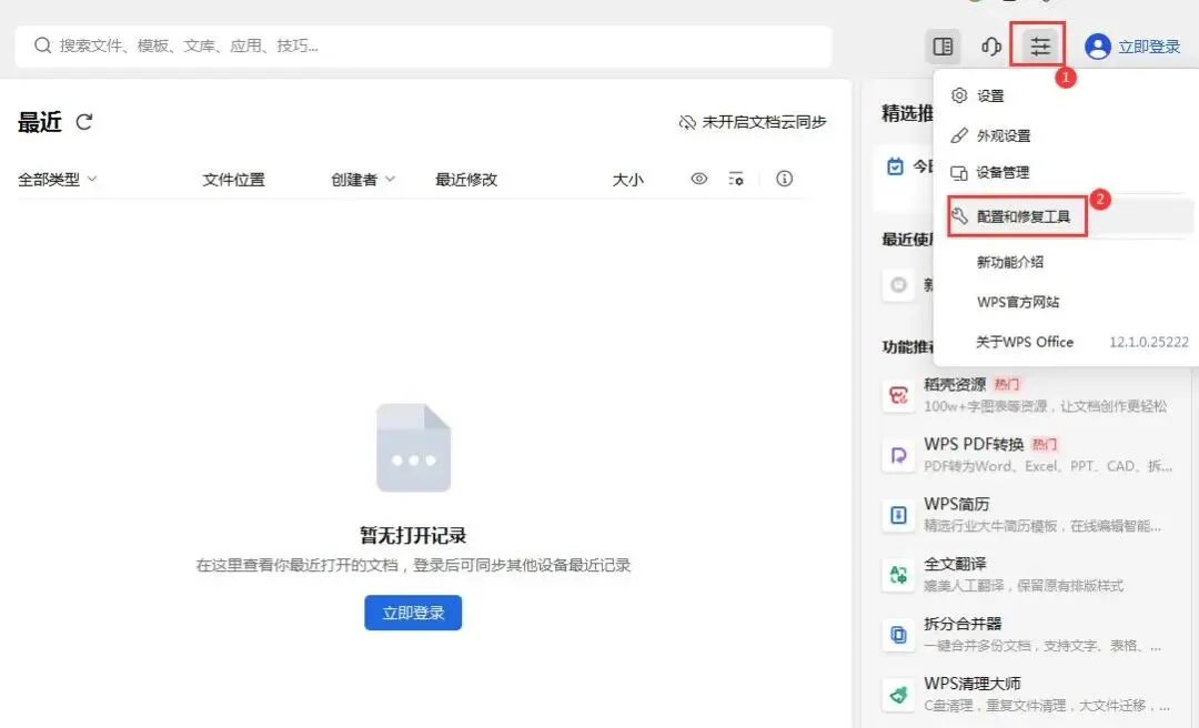 第一步:首先打开WPS软件,点击右上角的【全局设置】-【配置和修复工具】,调出“WPS Office 综合修复/配置工具”窗口,如下所示